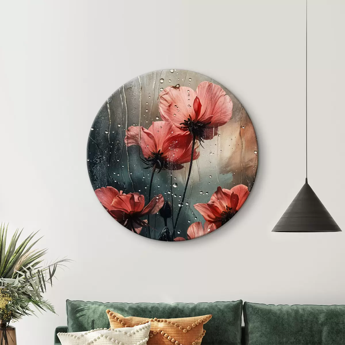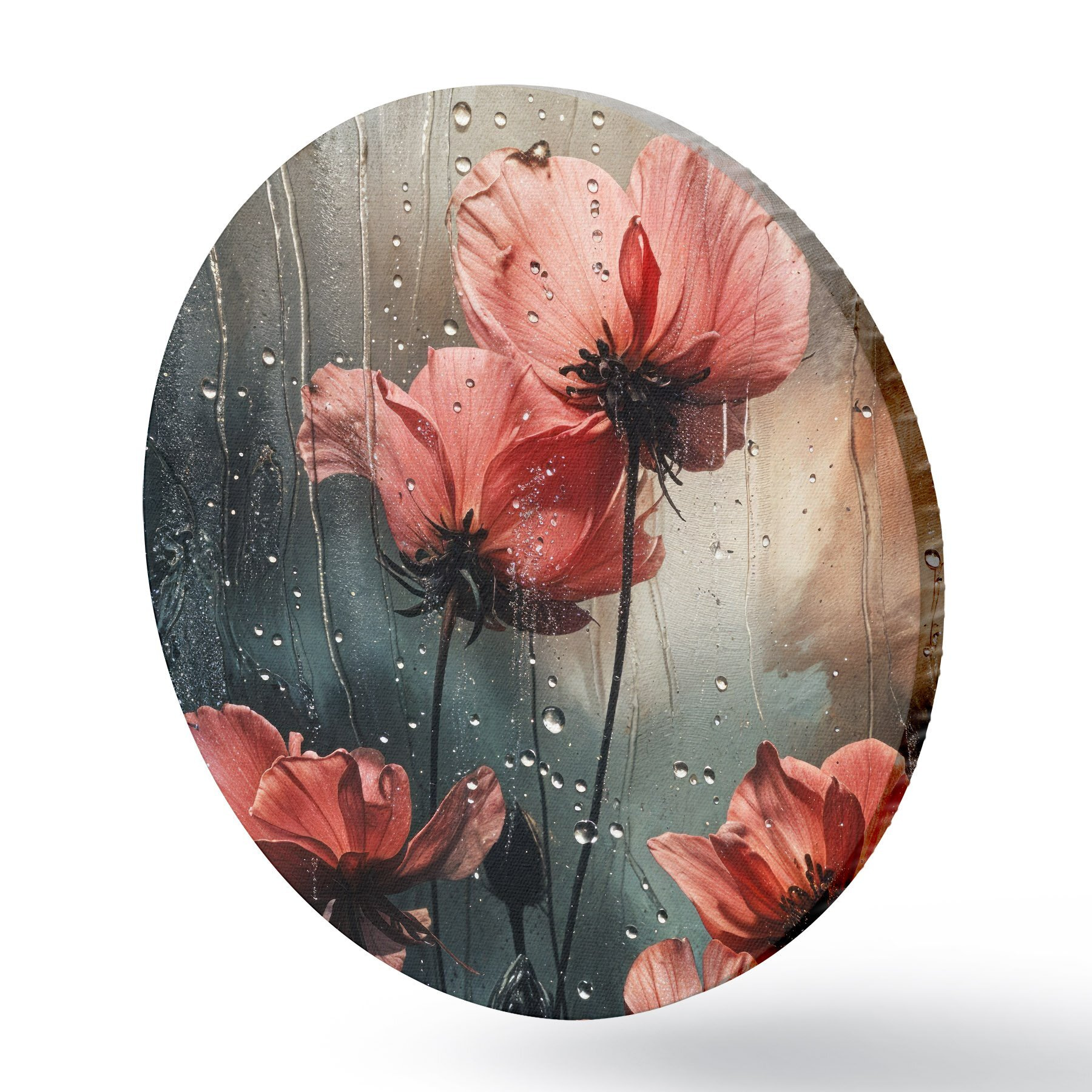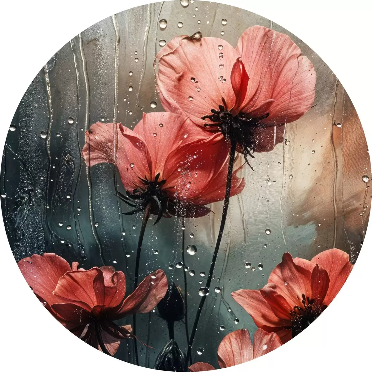 Quadri rotondi Fiori rossi con gocce d'acqua su uno sfondo sfocato r40412