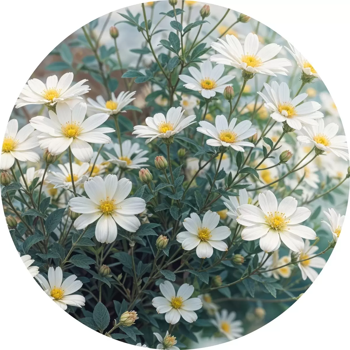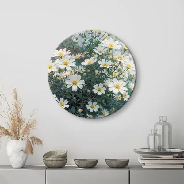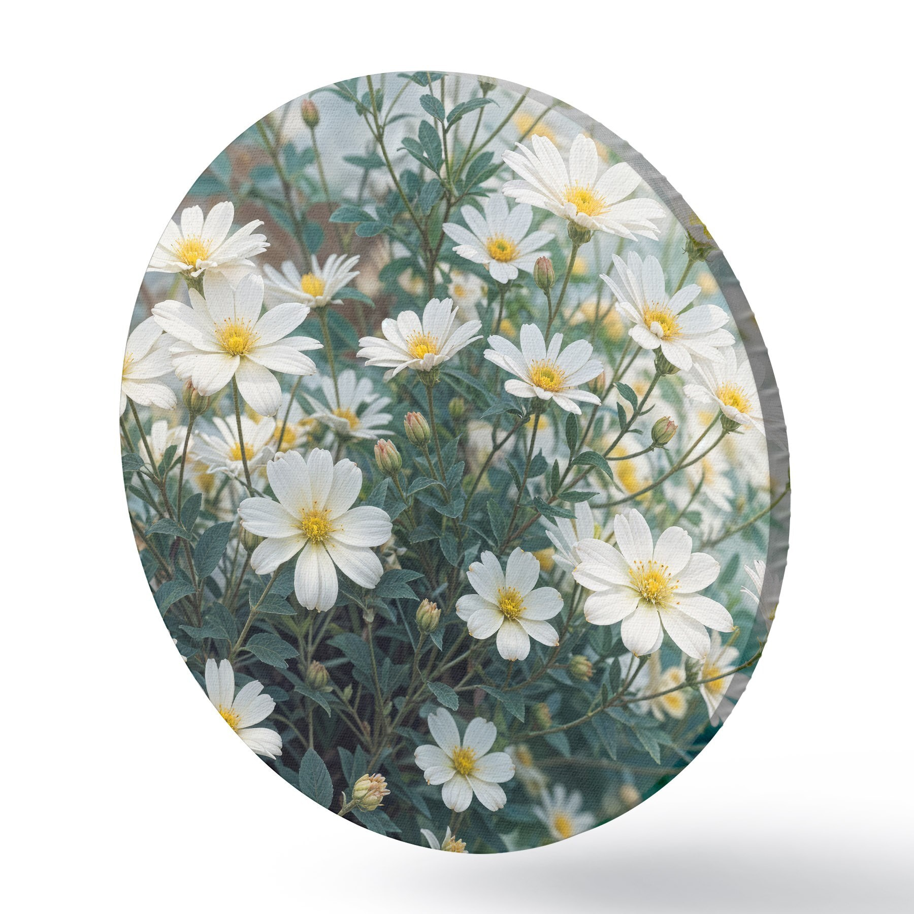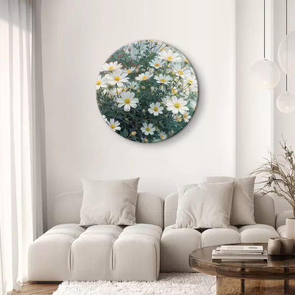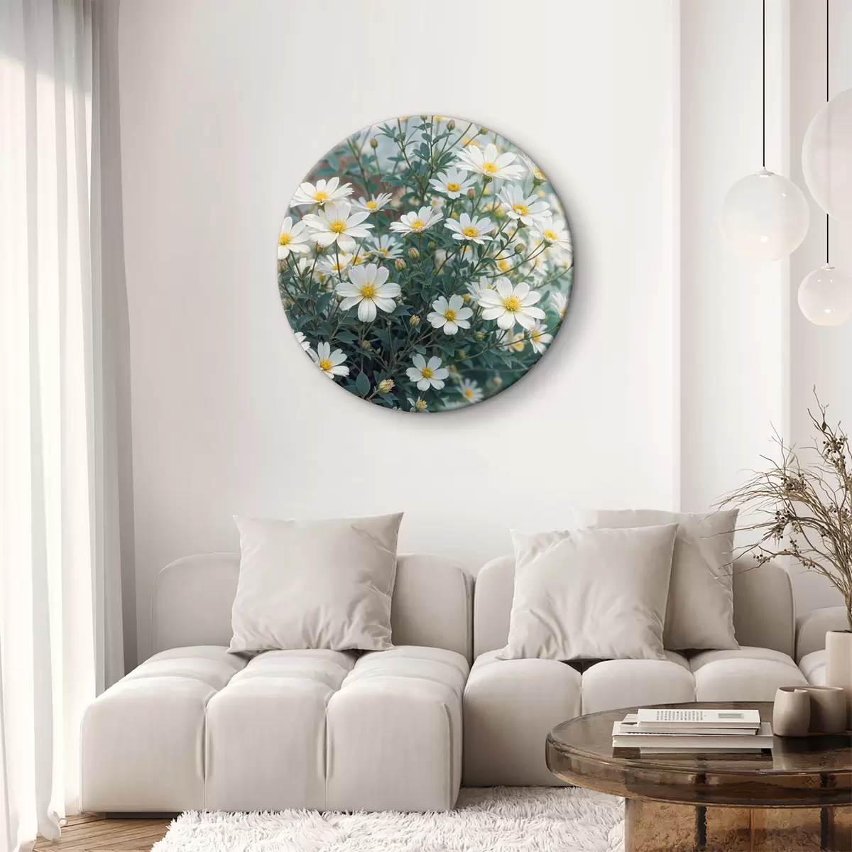 Quadri rotondi Un campo di fiori di margherita bianca con fogliame verde, su uno sfondo sfocato r40413