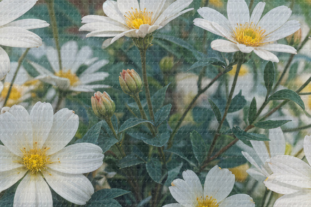 Immagine Un campo di fiori di margherita bianca con fogliame verde, su uno sfondo sfocato Nr r40413