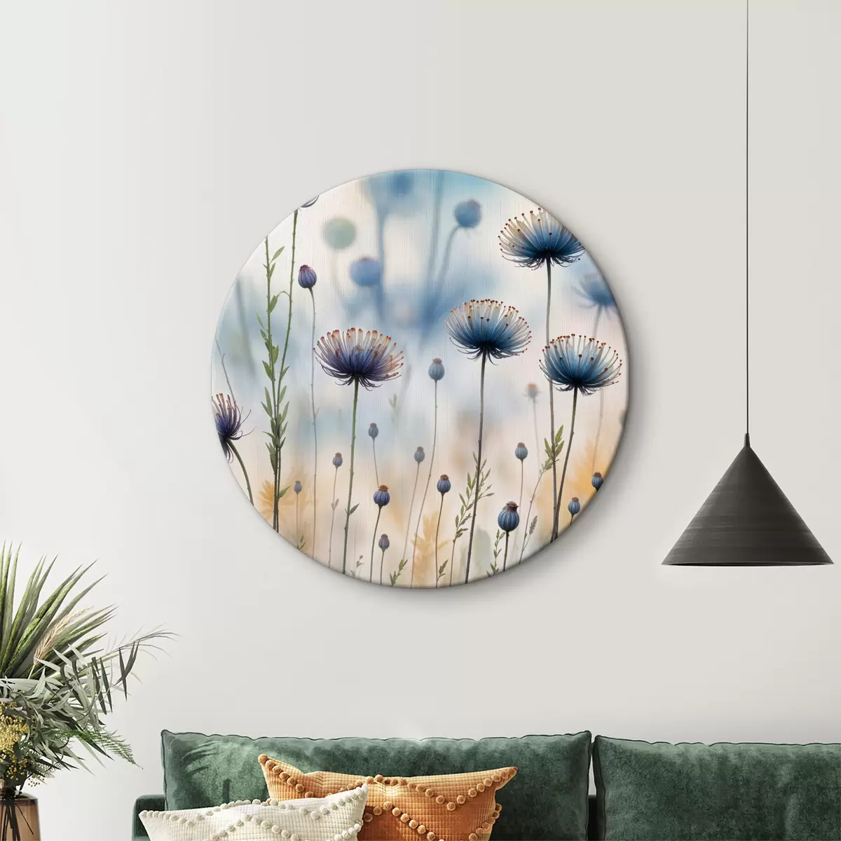 Quadri rotondi Alti fiori viola simili a denti di leone con sfondo sfocato, che creano un'atmosfera serena e sognante r40414