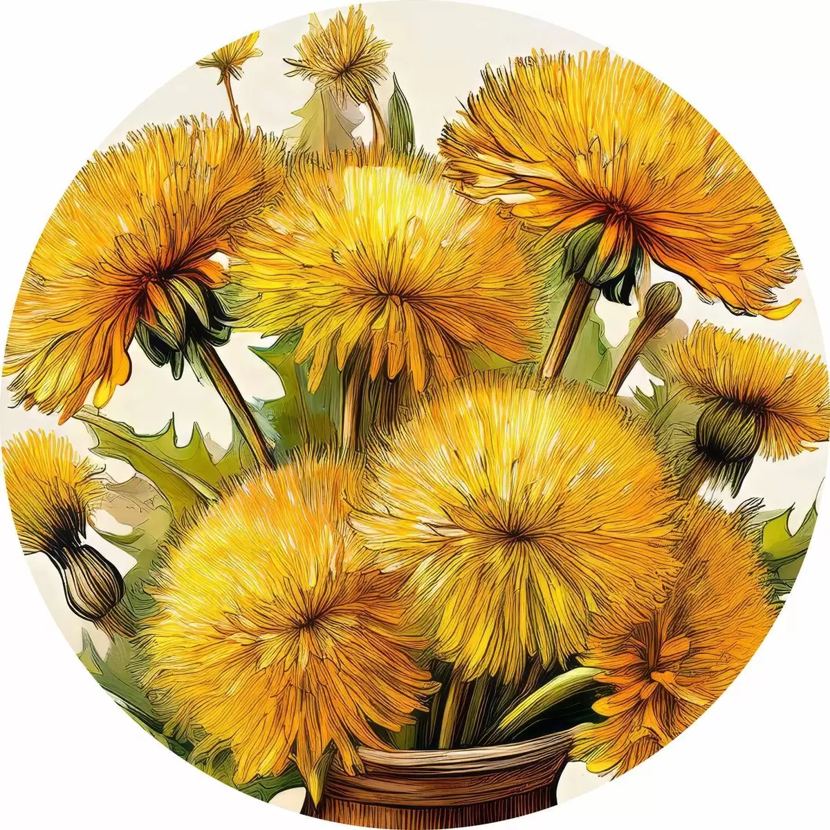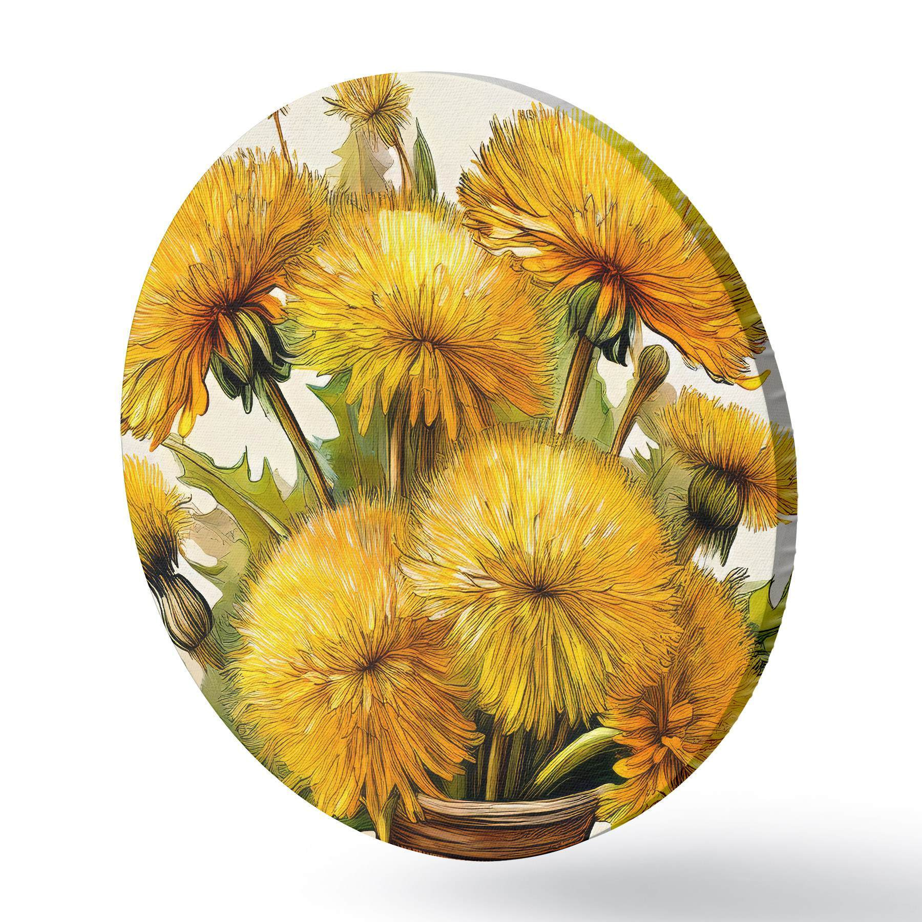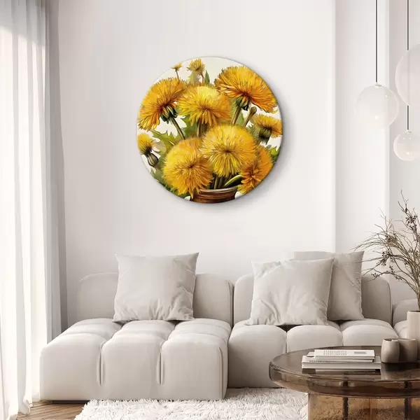 Quadri rotondi denti di leone, mazzo di denti di leone in un vaso, denti di leone gialli r40418