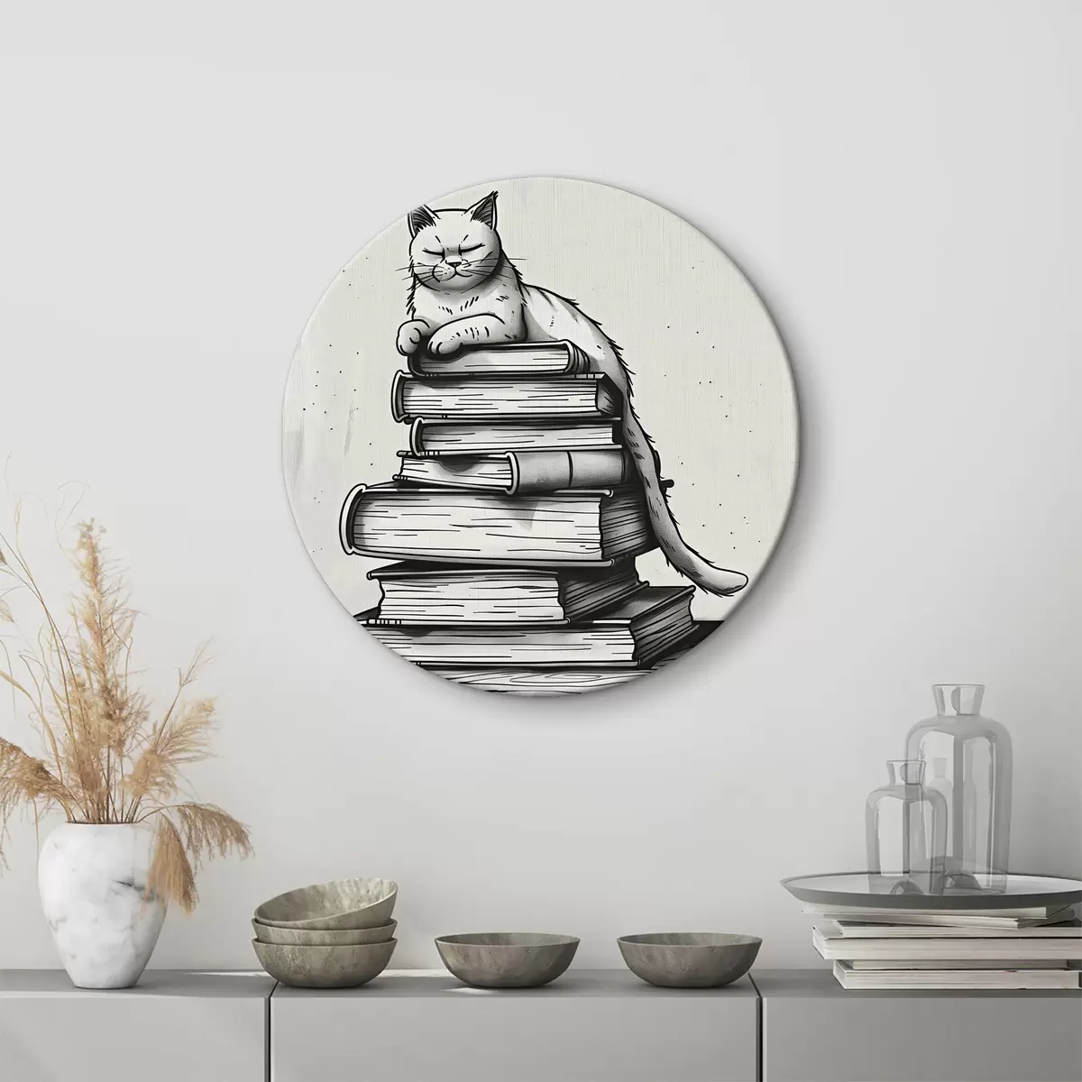Quadri rotondi Gatto bianco e nero su una pila di libri r40435