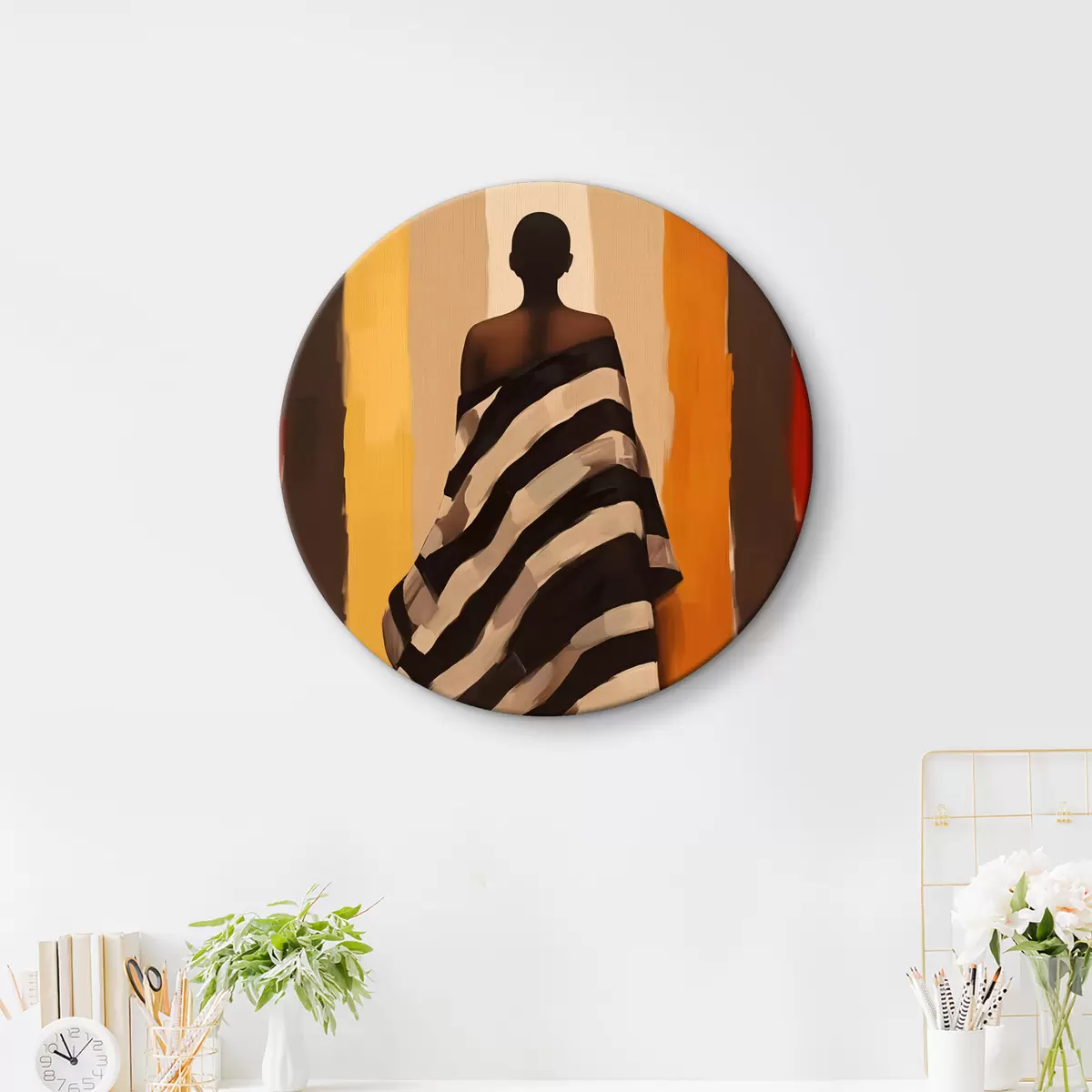Quadri rotondi Silhouette di una donna afroamericana con mantello a righe su uno sfondo a righe verticali, nero, beige, giallo, rosso, marrone r40487