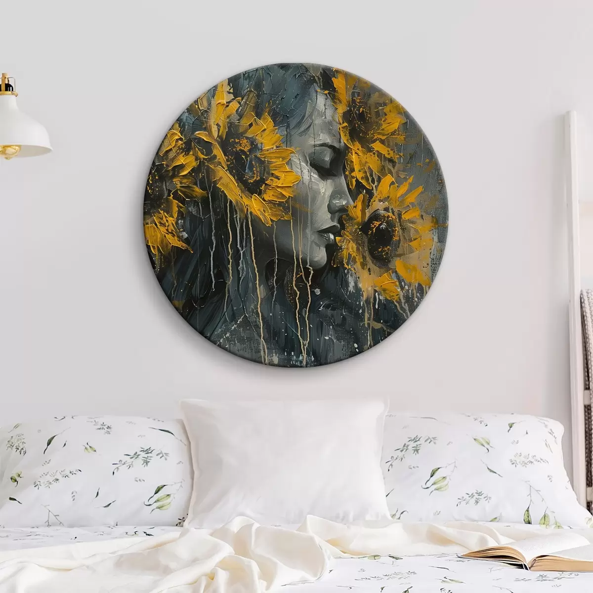 Quadri rotondi Il volto di una ragazza con i girasoli sfuocati r40502
