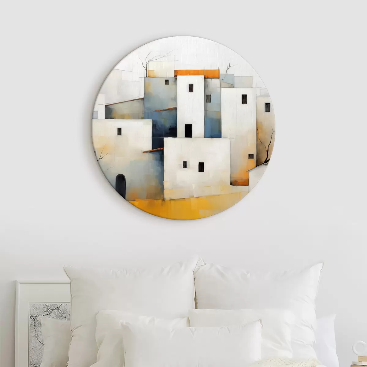 Quadri rotondi Case astratte stilizzate bianche, colori rosso, arancione, giallo, blu r40531