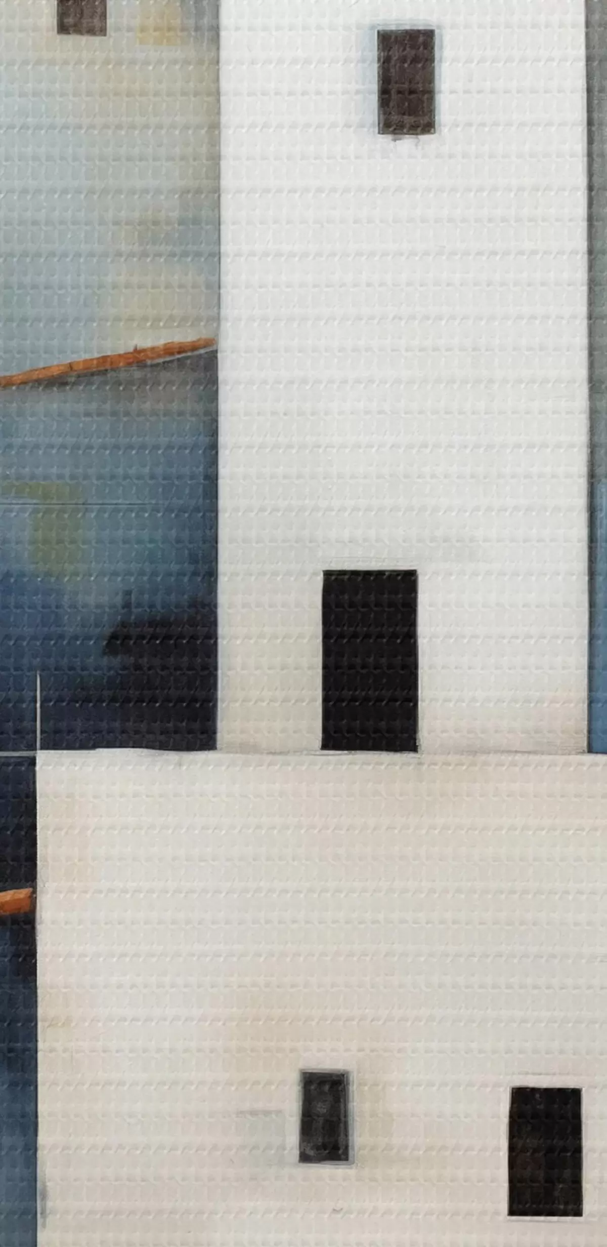 Immagine Case astratte stilizzate bianche, colori rosso, arancione, giallo, blu Nr r40531