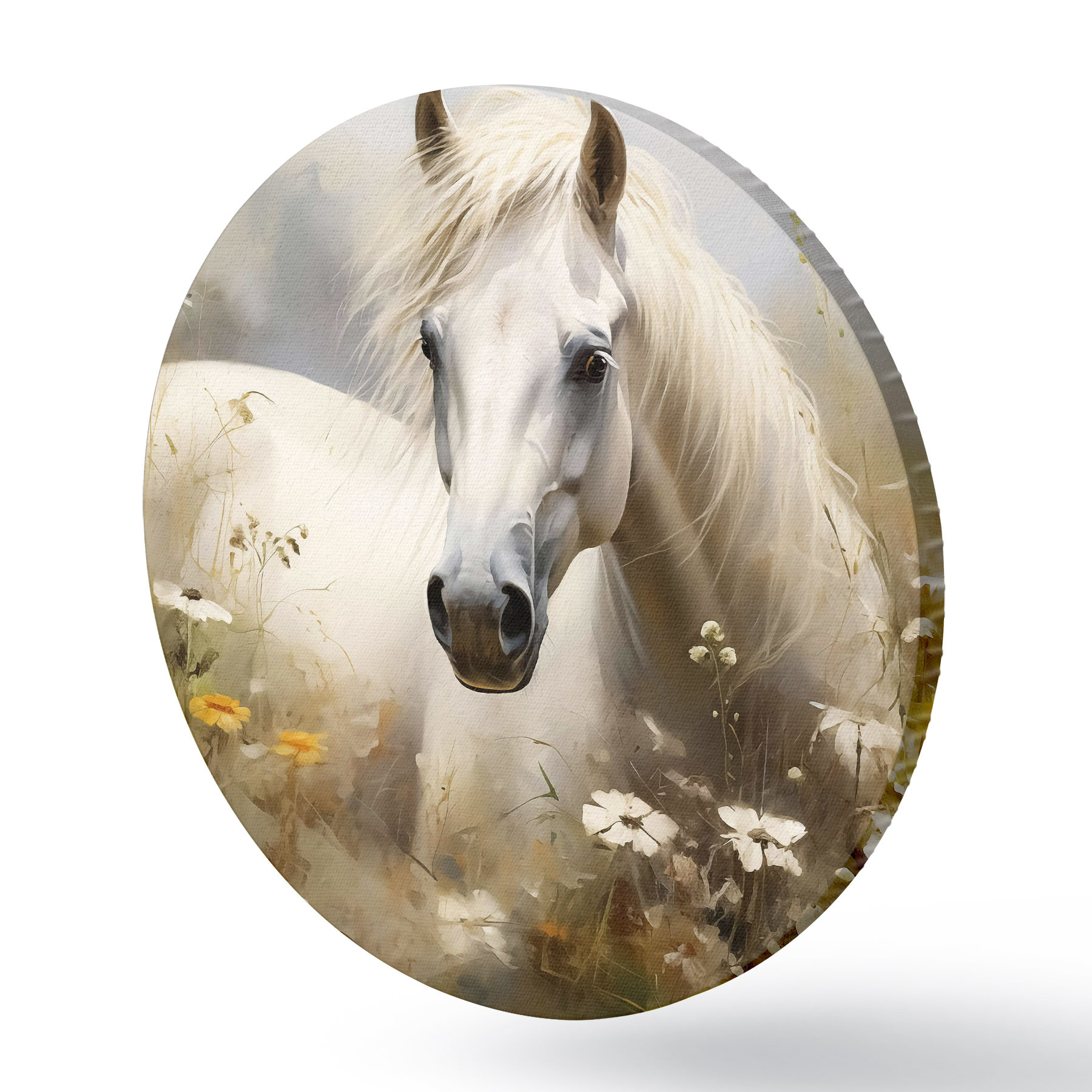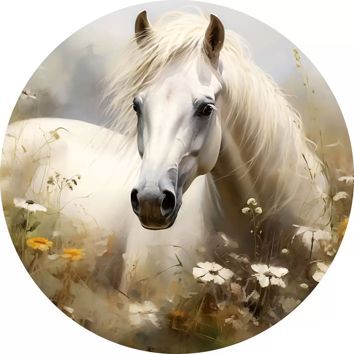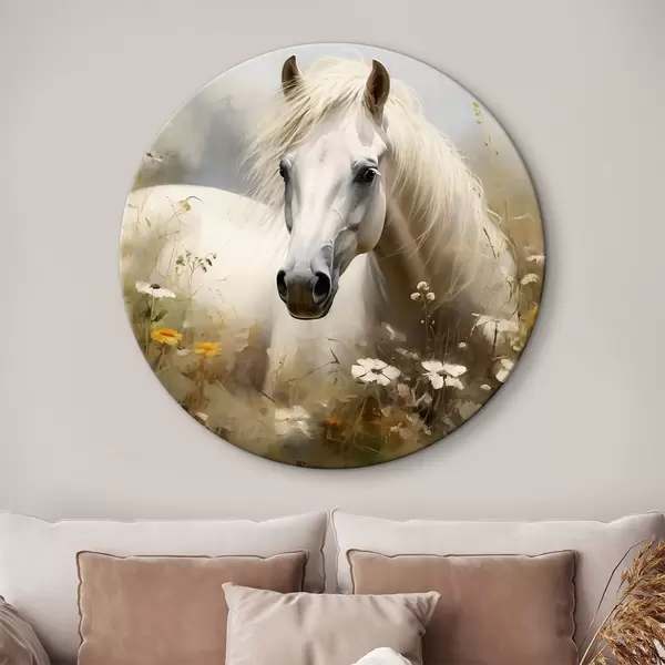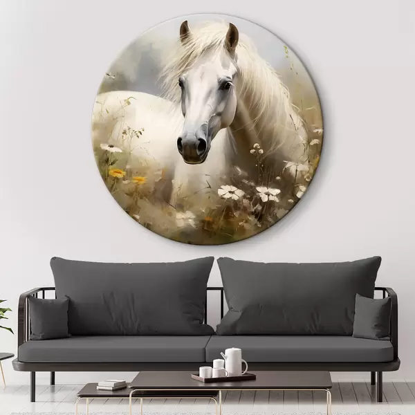 Quadri rotondi Cavallo bianco nell'erba tra le margherite r40533