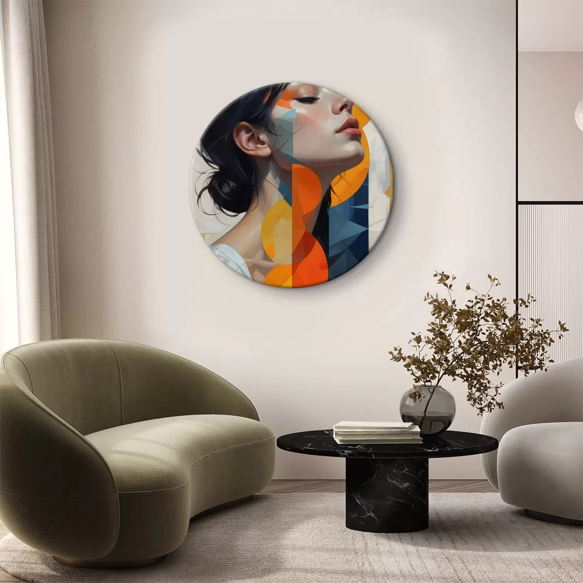 Quadri rotondi Un dipinto astratto che raffigura una donna dai capelli lunghi e scuri, che indossa una camicia bianca con una stampa geometrica colorata r40543