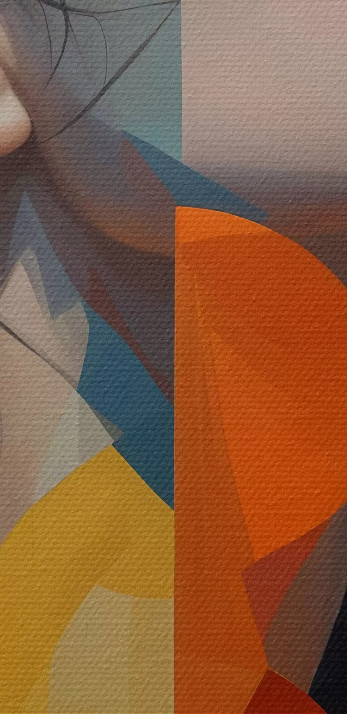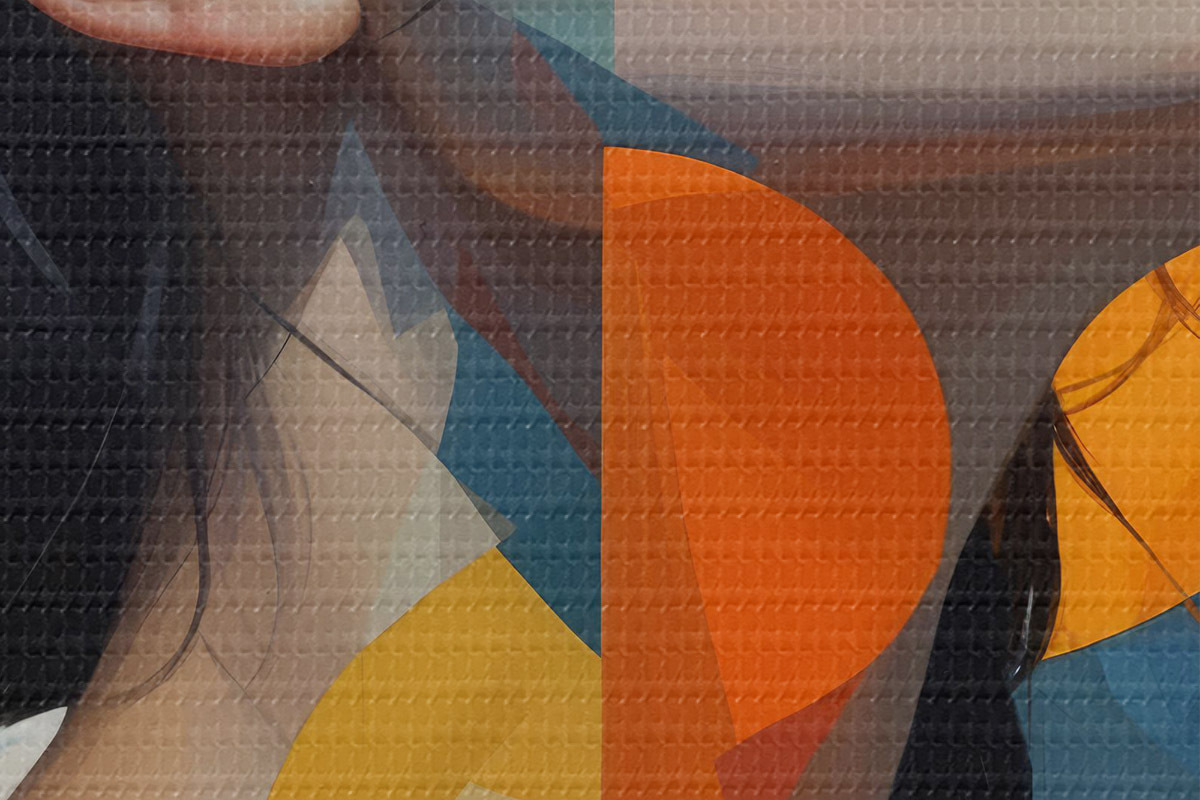 Immagine Un dipinto astratto che raffigura una donna dai capelli lunghi e scuri, che indossa una camicia bianca con una stampa geometrica colorata Nr r40543