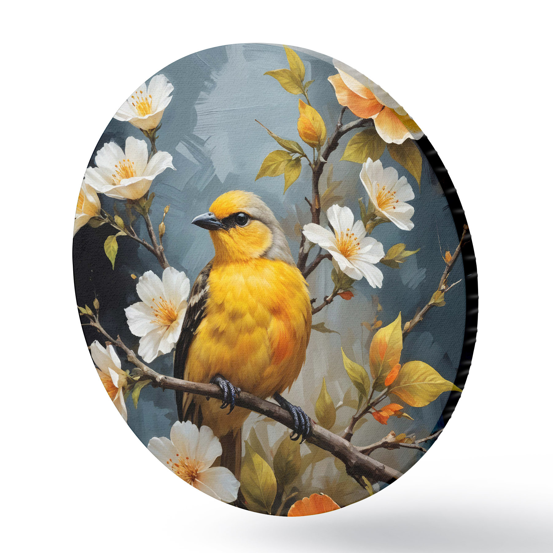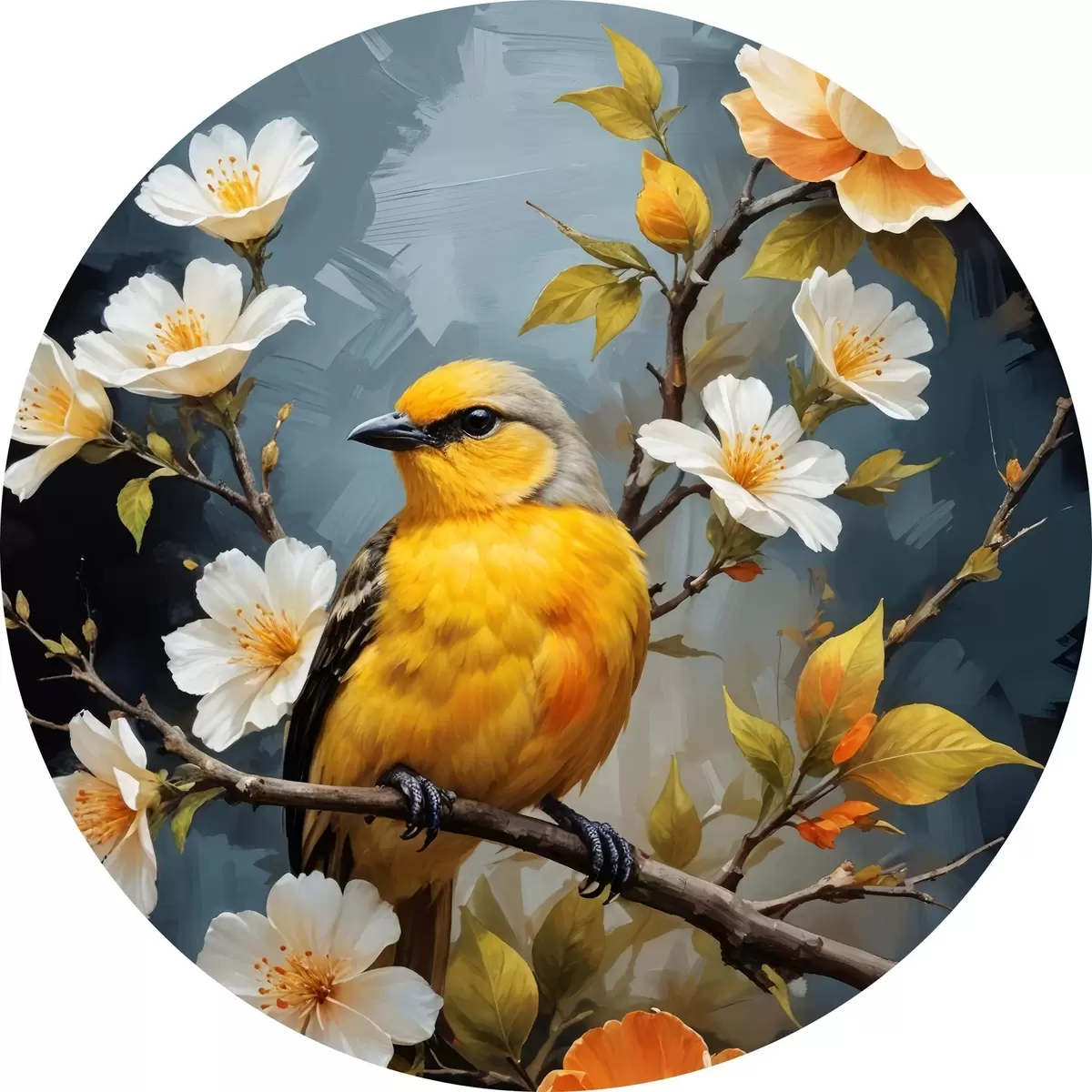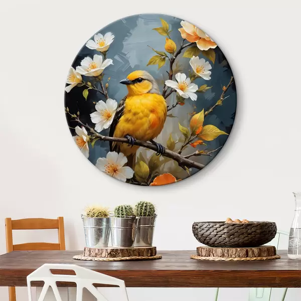 Quadri rotondi Uccello giallo seduto su un ramo con fiori bianchi e arancioni sullo sfondo r40550