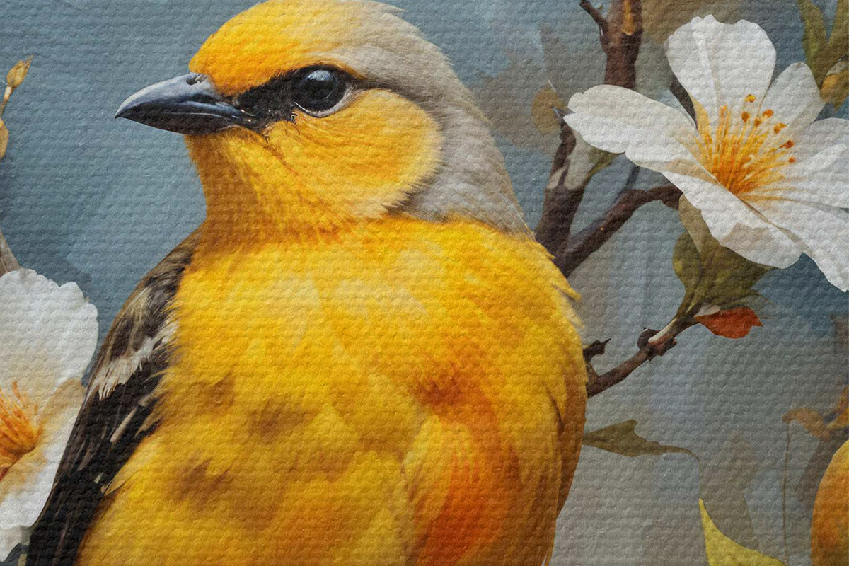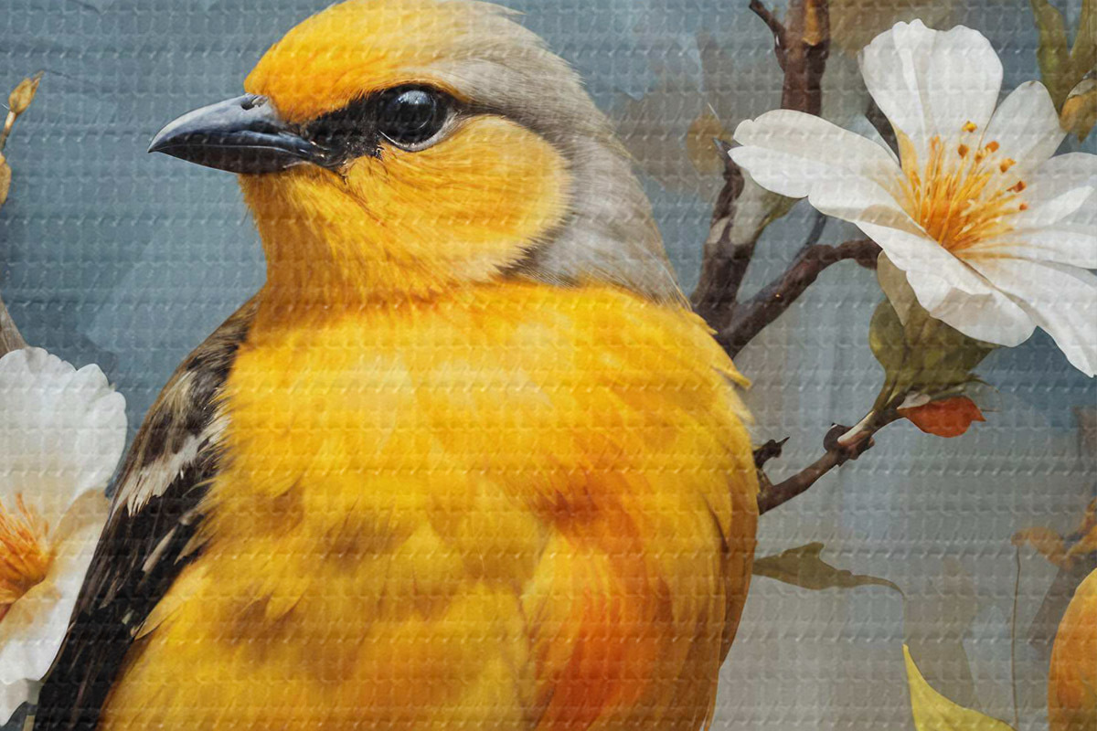 Immagine Uccello giallo seduto su un ramo con fiori bianchi e arancioni sullo sfondo Nr r40550
