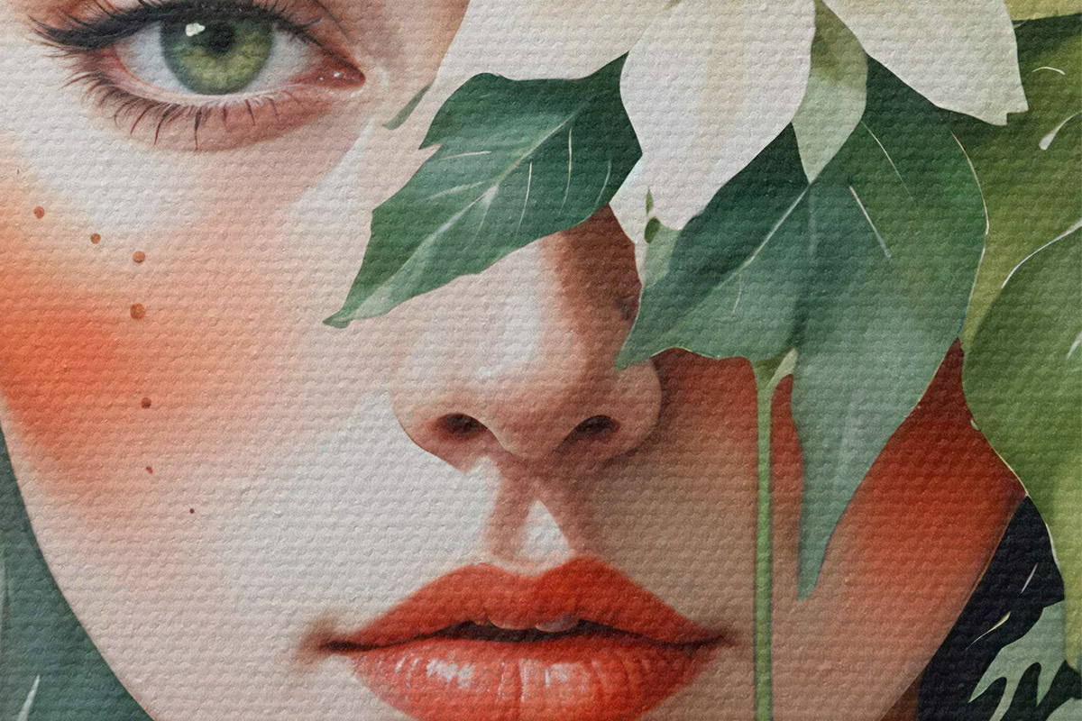 Immagine Donna dai capelli biondi circondata da fiori tropicali bianchi e arancioni, foglie verdi e vegetazione Nr r40557