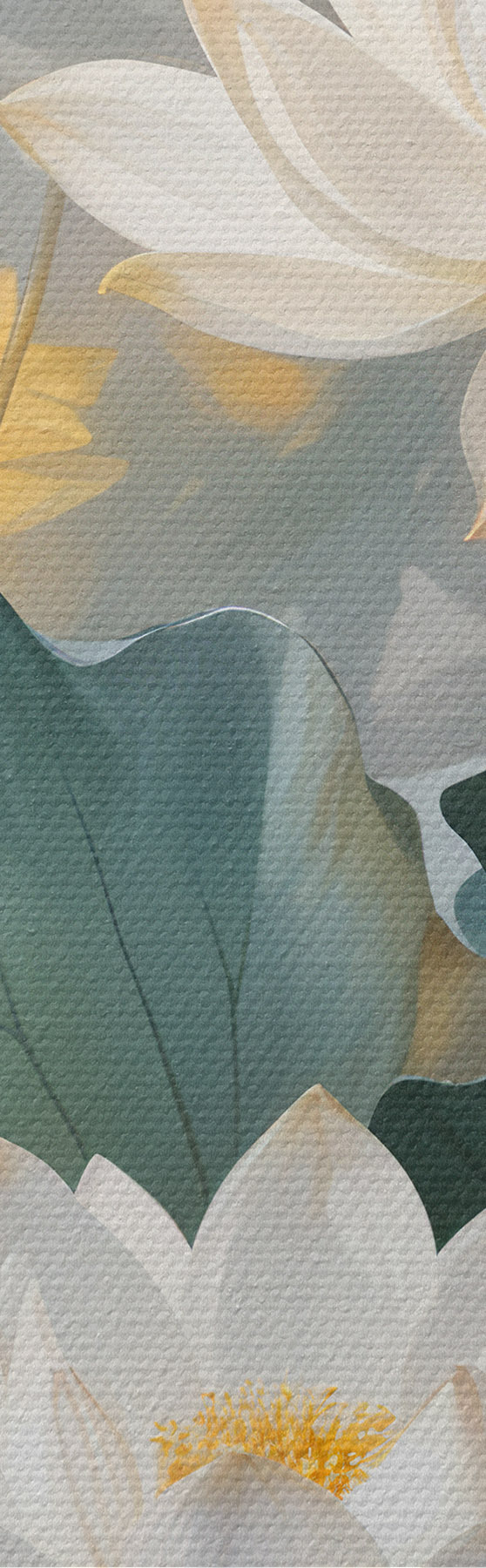 Immagine Fiori di loto bianchi in uno stagno con petali di ninfea verde, circondati da fiori gialli e sfondo sfocato Nr r40559