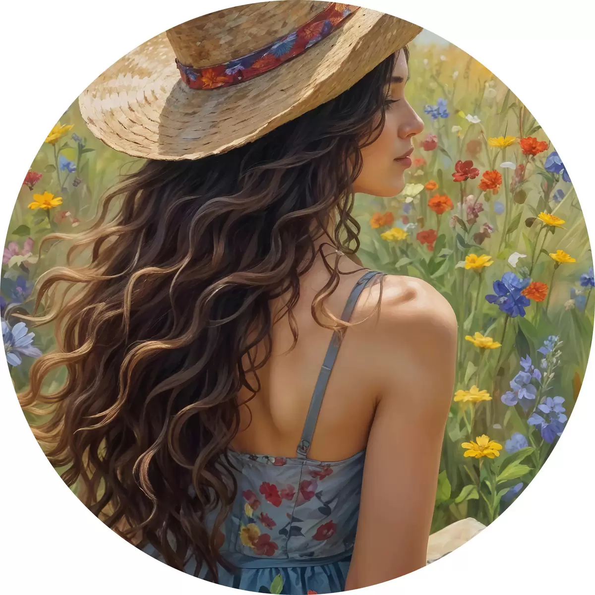 Immagine Giovane donna con i capelli ricci, con un cappello di paglia e un vestito floreale, in piedi in un campo di fiori di campo Nr r40560