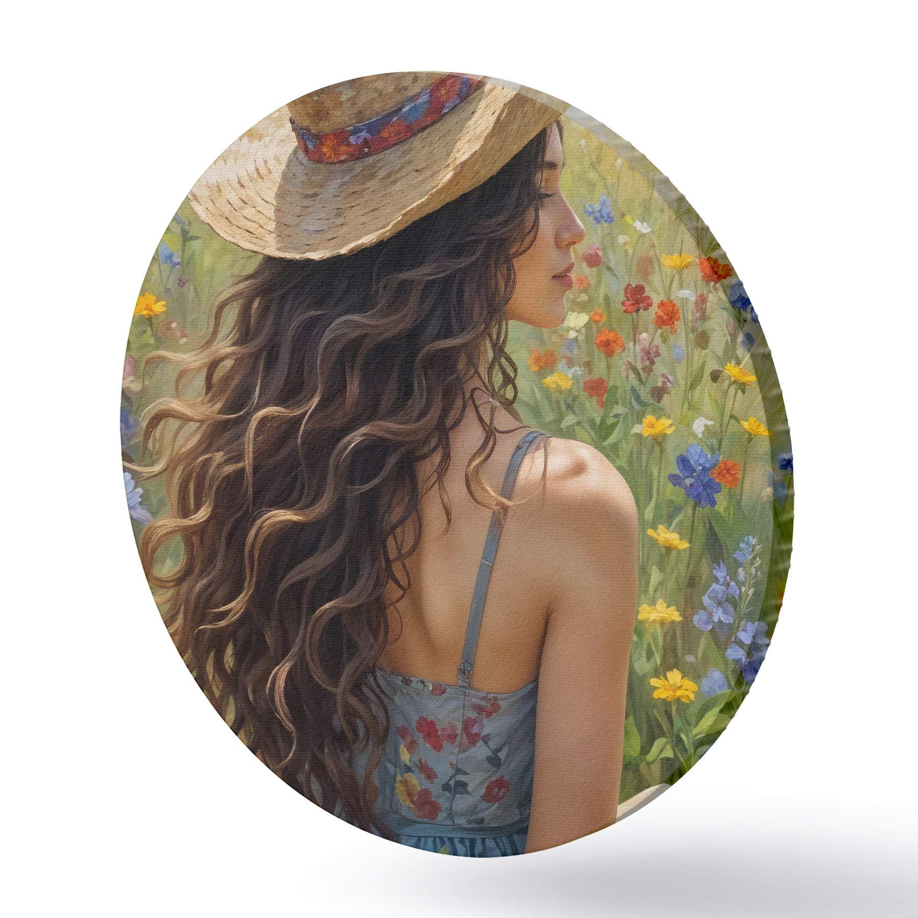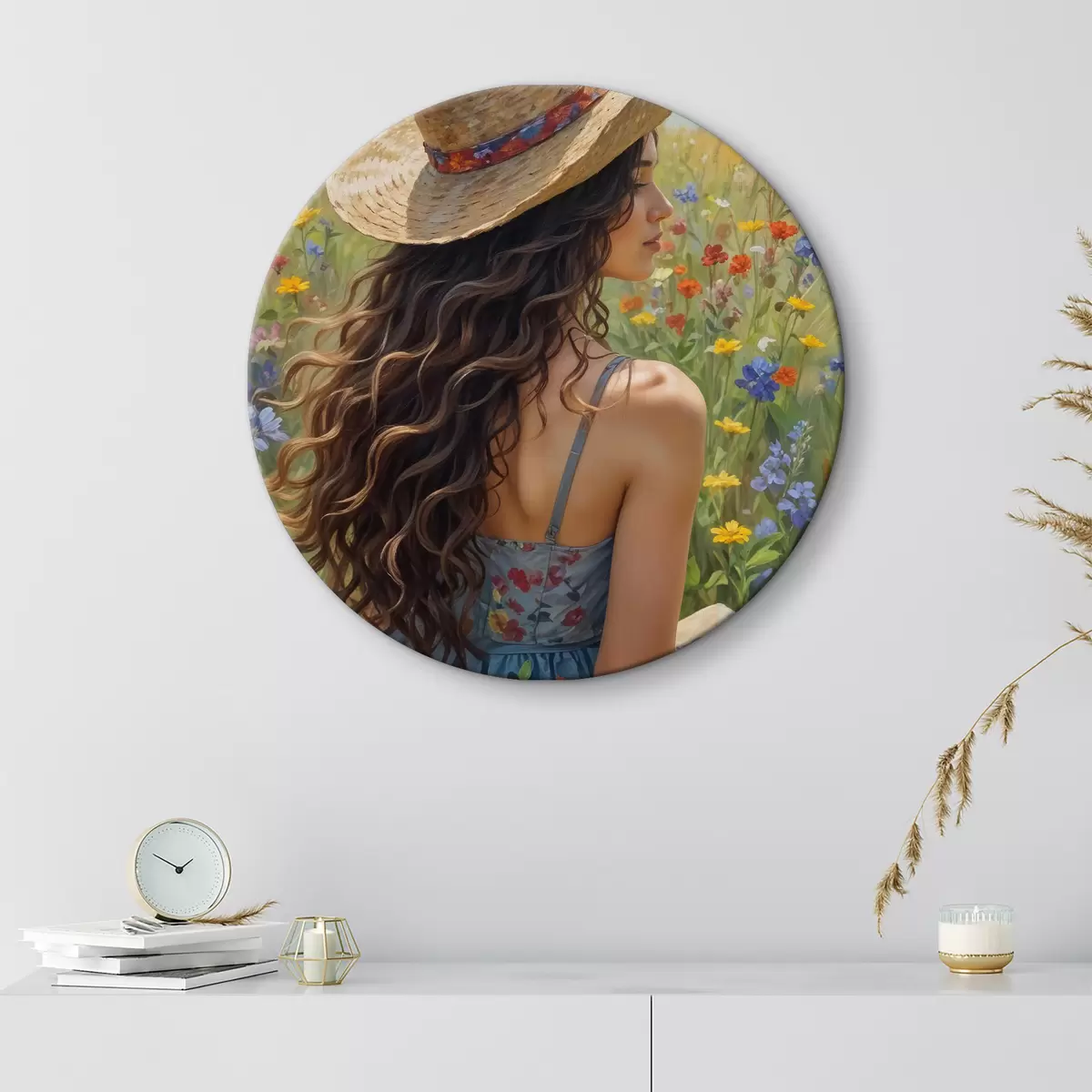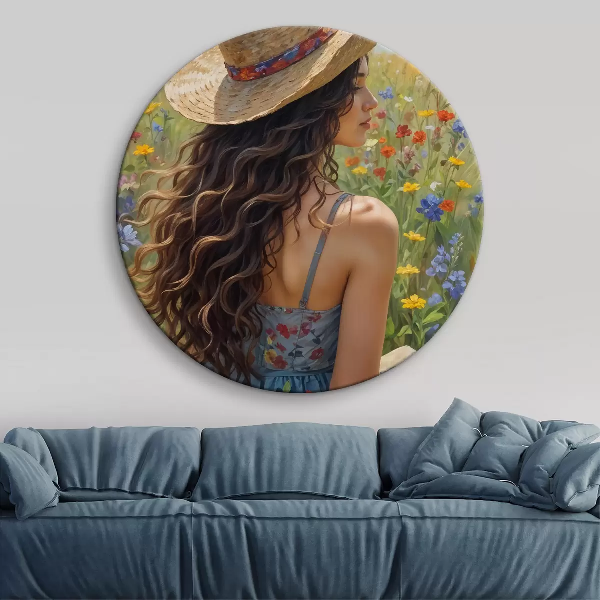 Quadri rotondi Giovane donna con i capelli ricci, con un cappello di paglia e un vestito floreale, in piedi in un campo di fiori di campo r40560