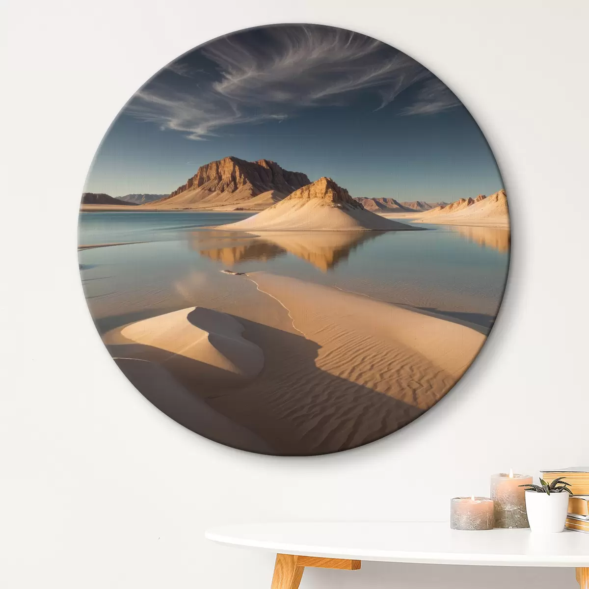Quadri rotondi Un vasto paesaggio desertico con alte formazioni rocciose che si riflettono nell'acqua bassa r40568