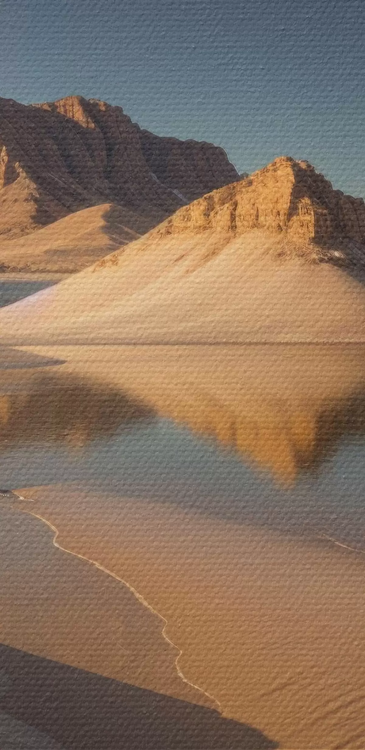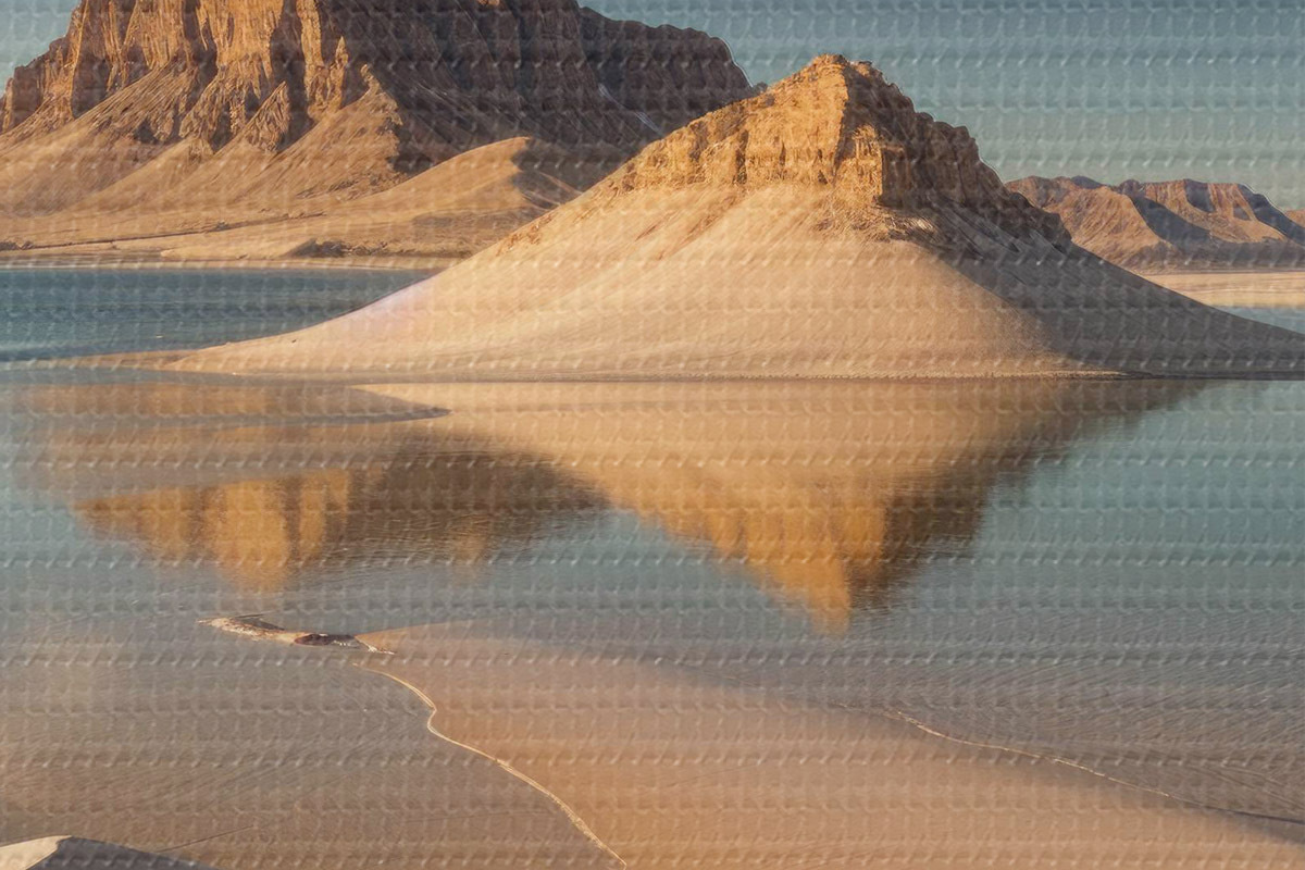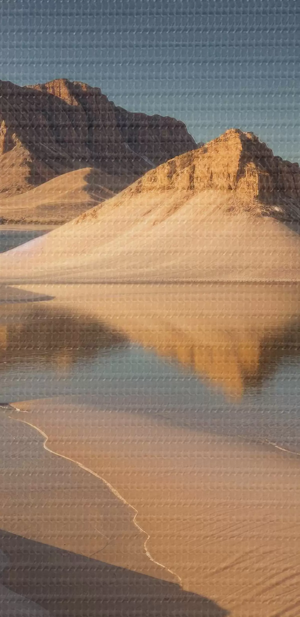 Immagine Un vasto paesaggio desertico con alte formazioni rocciose che si riflettono nell'acqua bassa Nr r40568