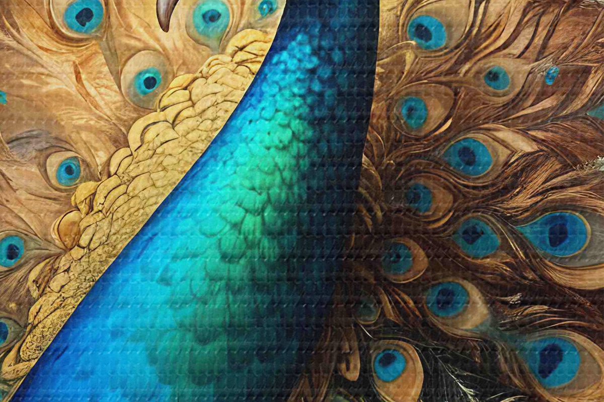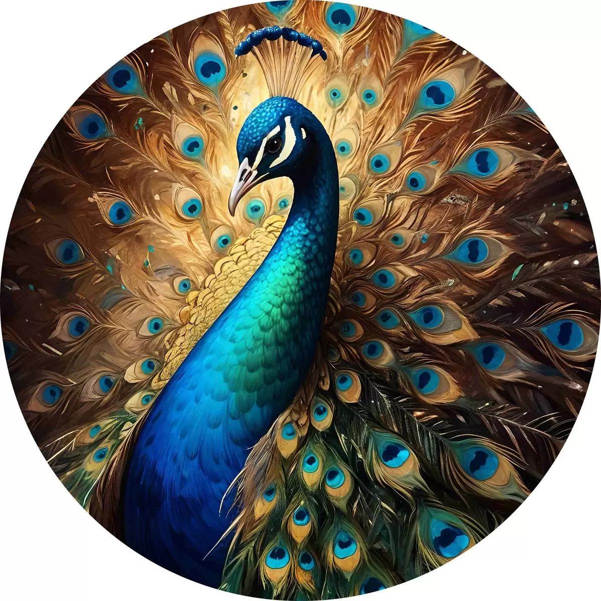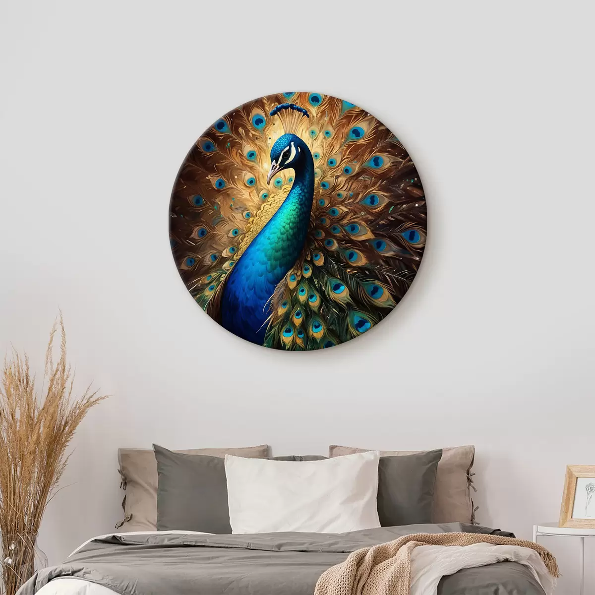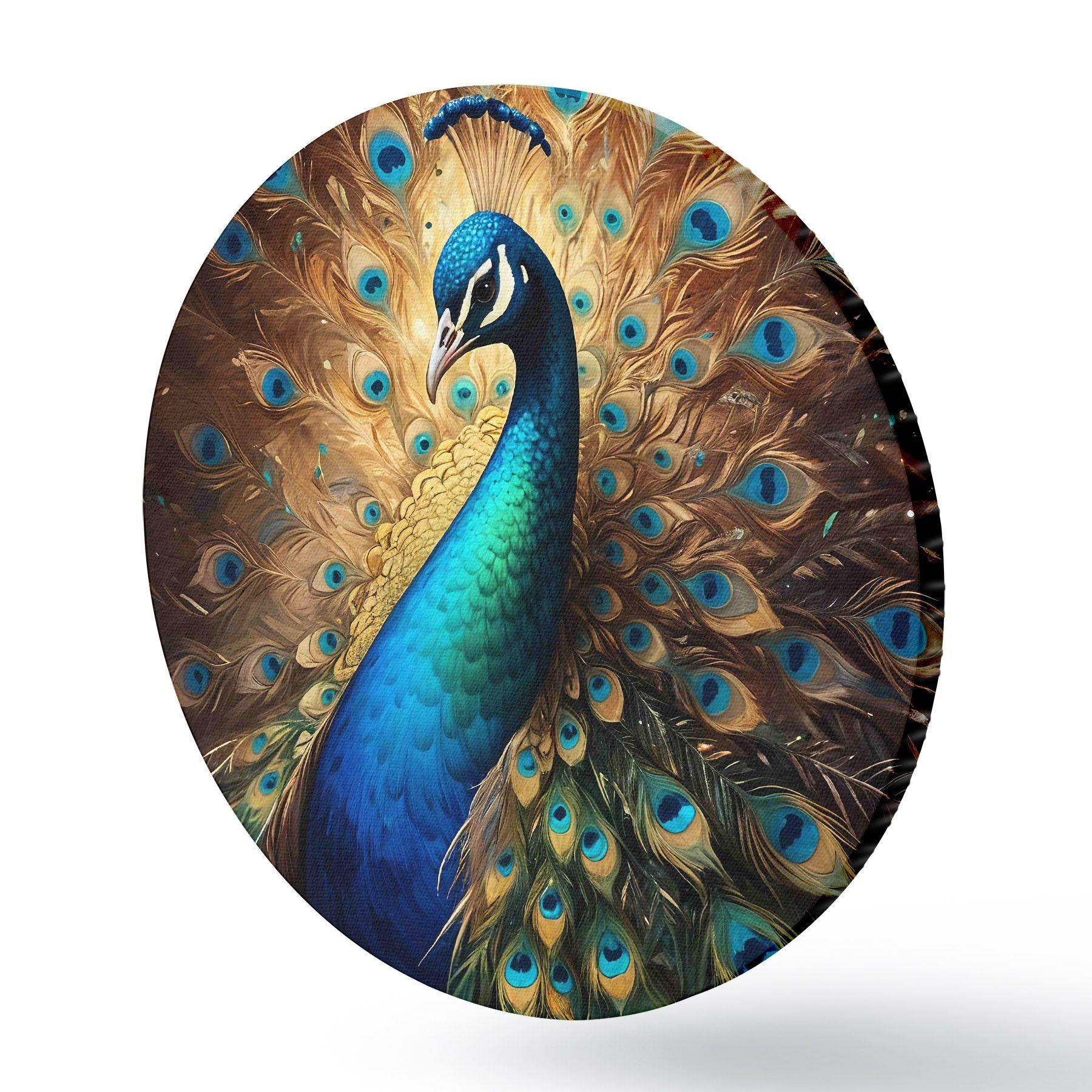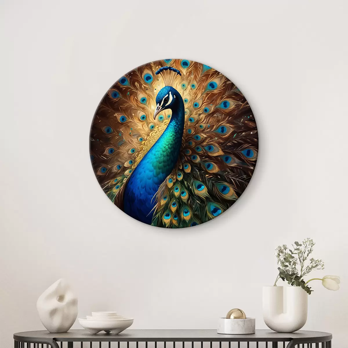 Quadri rotondi Un vivace pavone con le piume completamente esposte, che sfoggia uno splendido piumaggio blu e verde r40571