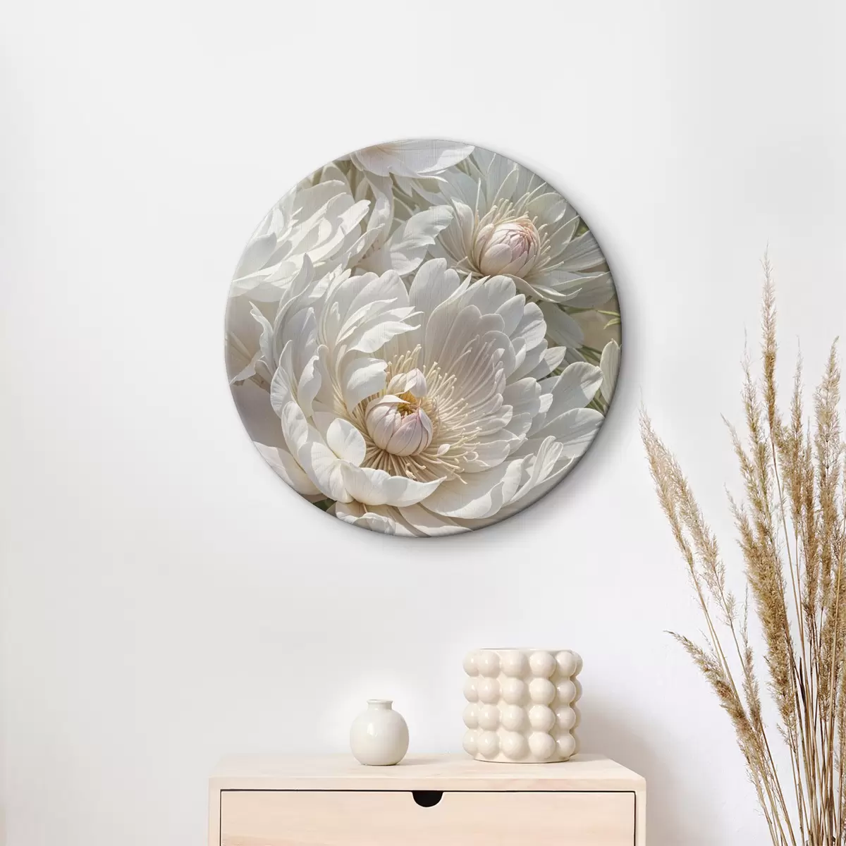 Quadri rotondi Un primo piano di alcuni grandi fiori di peonia bianca con petali morbidi e delicati e centri di colore giallo brillante r40575