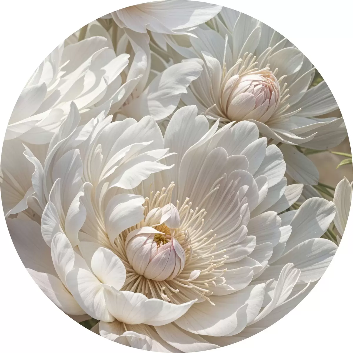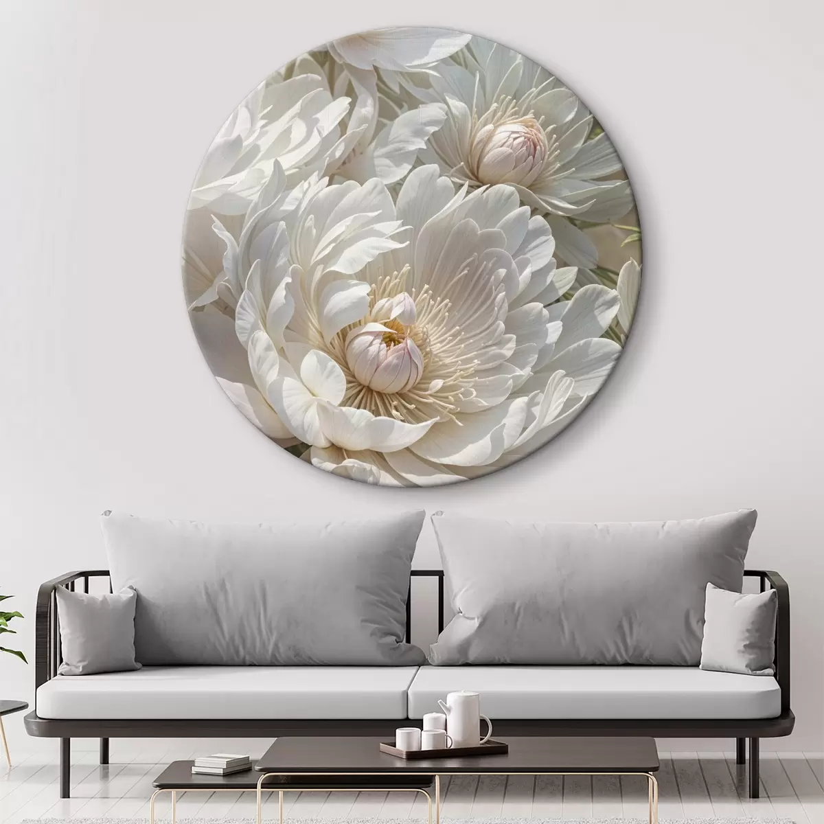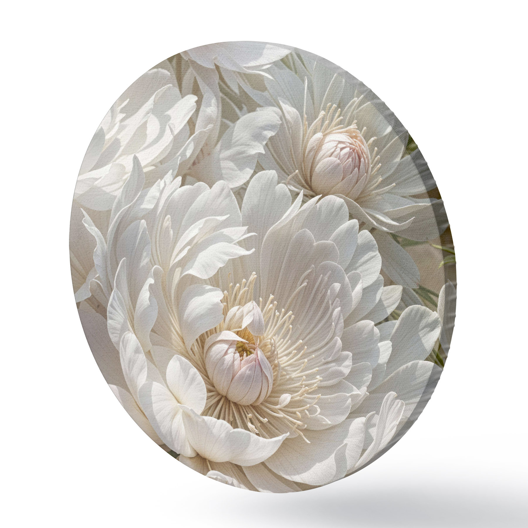 Quadri rotondi Un primo piano di alcuni grandi fiori di peonia bianca con petali morbidi e delicati e centri di colore giallo brillante r40575
