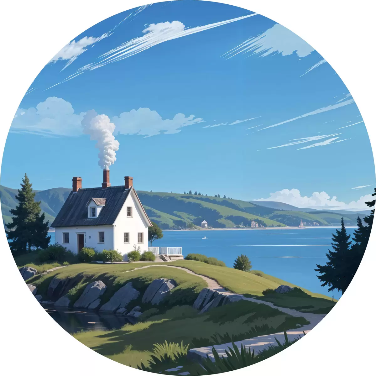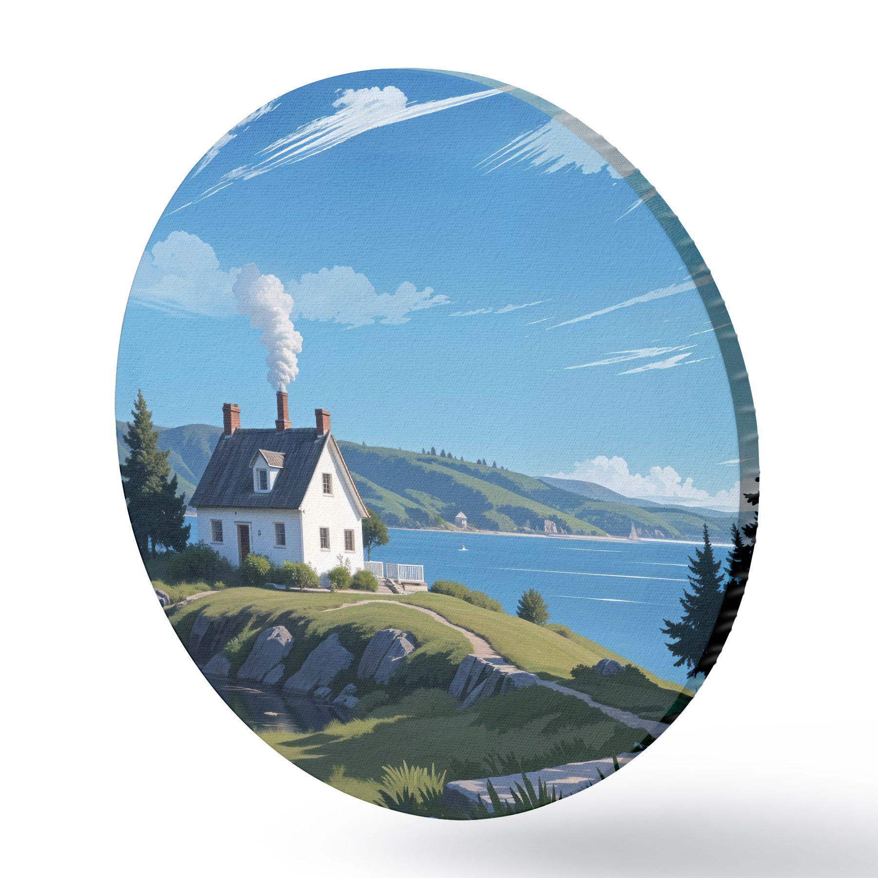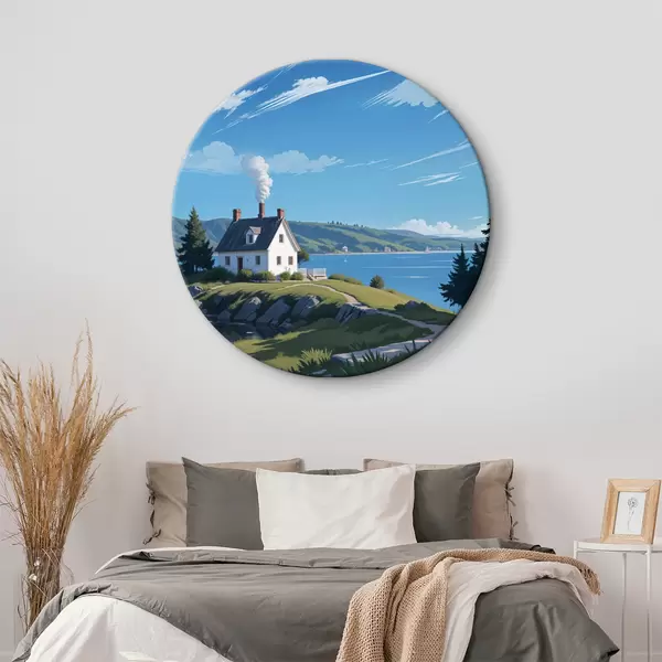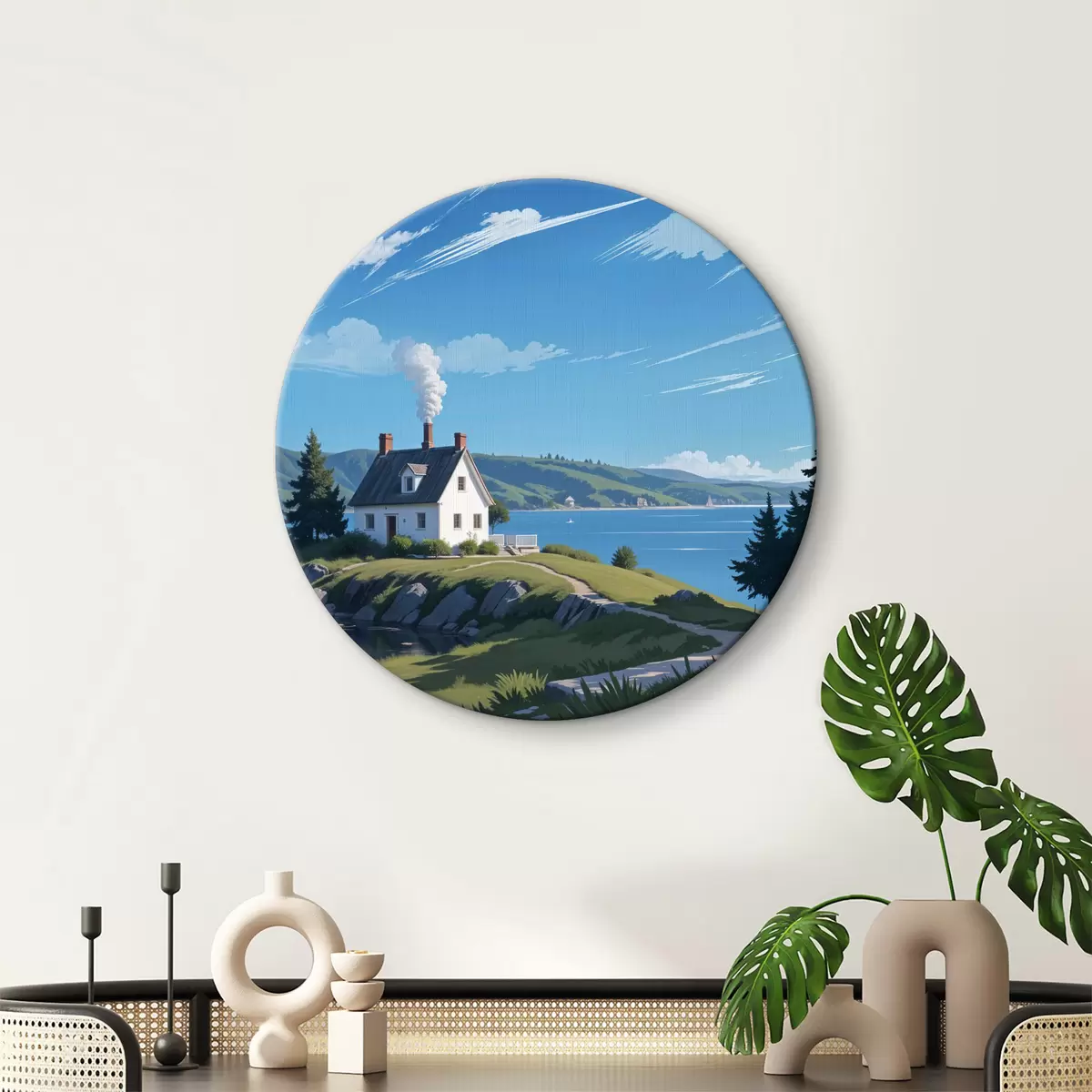 Quadri rotondi Una casa bianca su una collina erbosa con montagne sullo sfondo e un cielo blu con nuvole gonfie r40587