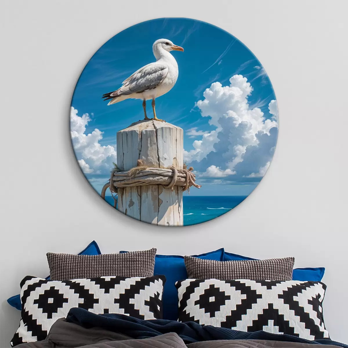 Quadri rotondi Un gabbiano bianco seduto su un palo di legno sullo sfondo di un cielo azzurro e di un oceano con onde r40590