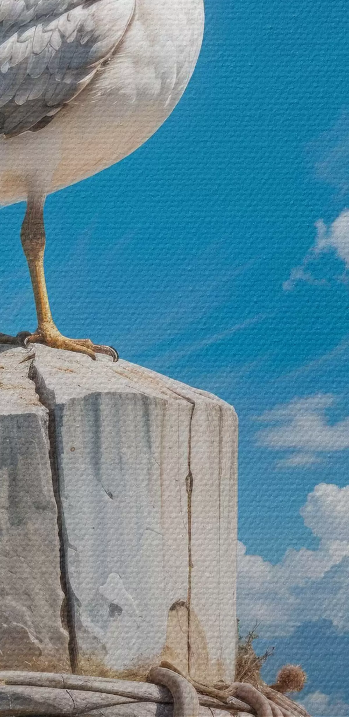Immagine Un gabbiano bianco seduto su un palo di legno sullo sfondo di un cielo azzurro e di un oceano con onde Nr r40590