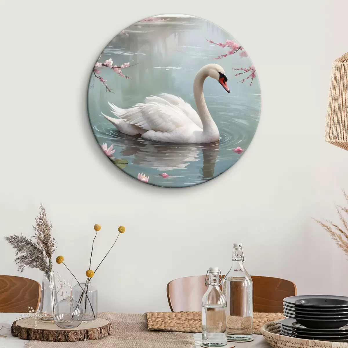 Quadri rotondi Grazioso cigno bianco che nuota in uno stagno tranquillo circondato da ciliegi rosa in fiore r40597