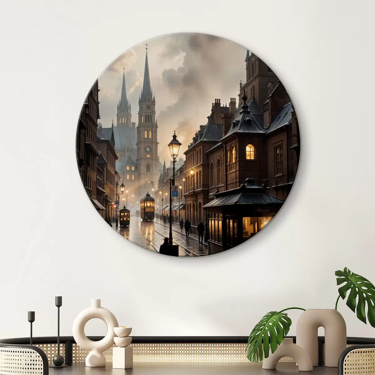 Quadri rotondi Serata piovosa in una vecchia città europea, con strade acciottolate, edifici storici e un tram di passaggio r40604