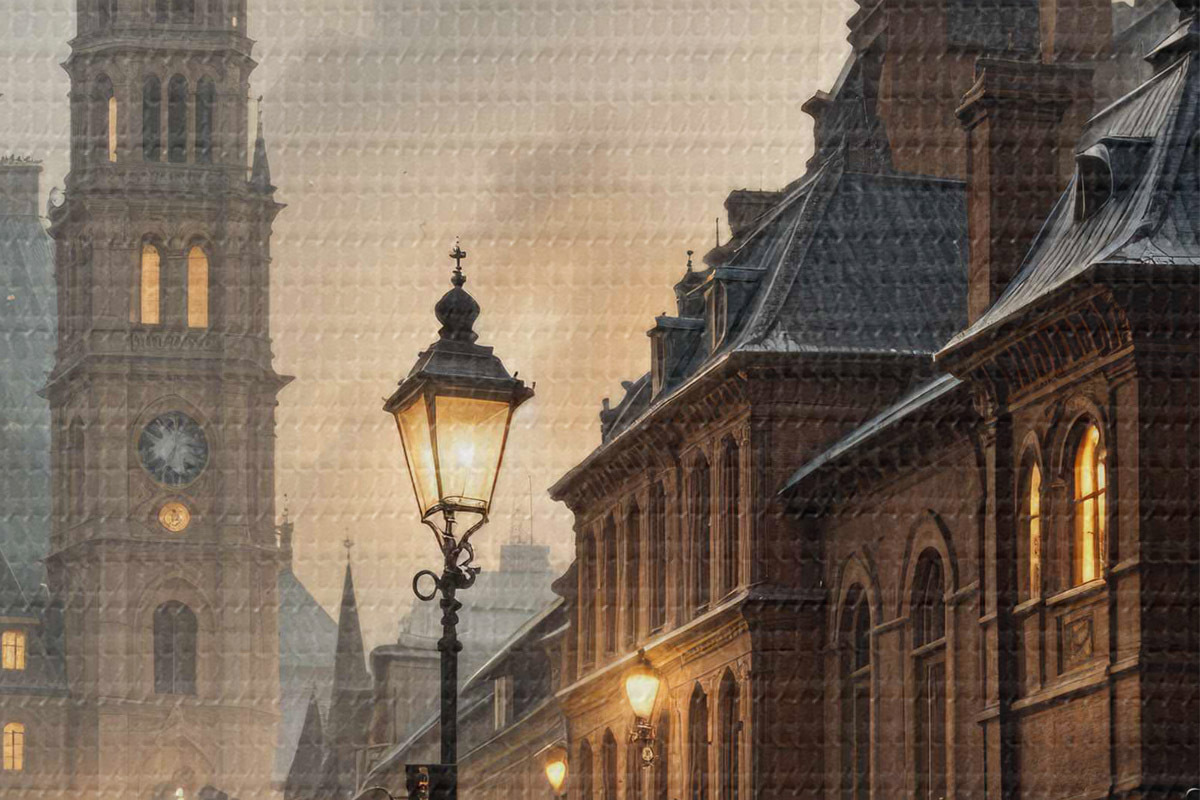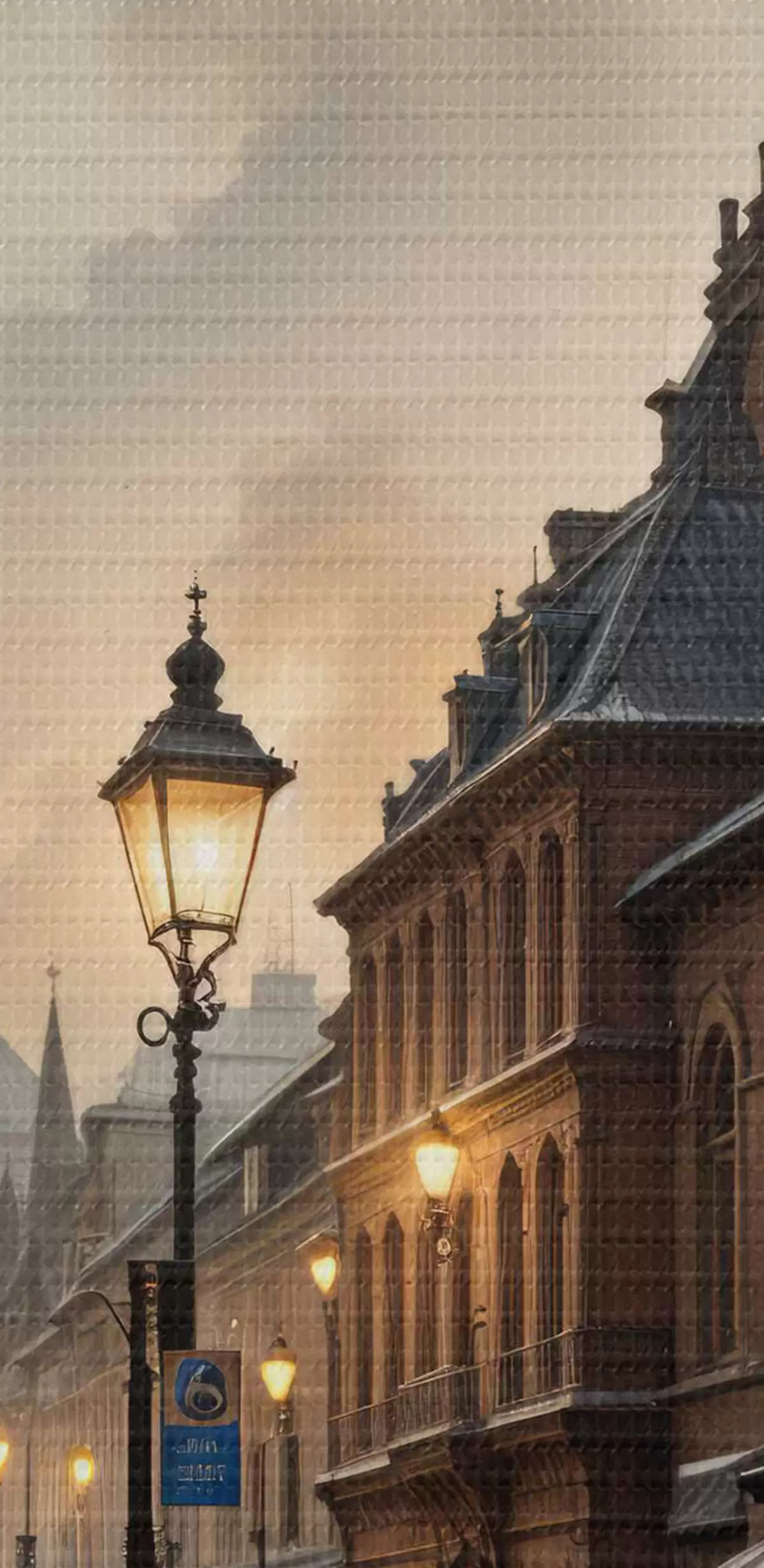 Immagine Serata piovosa in una vecchia città europea, con strade acciottolate, edifici storici e un tram di passaggio Nr r40604
