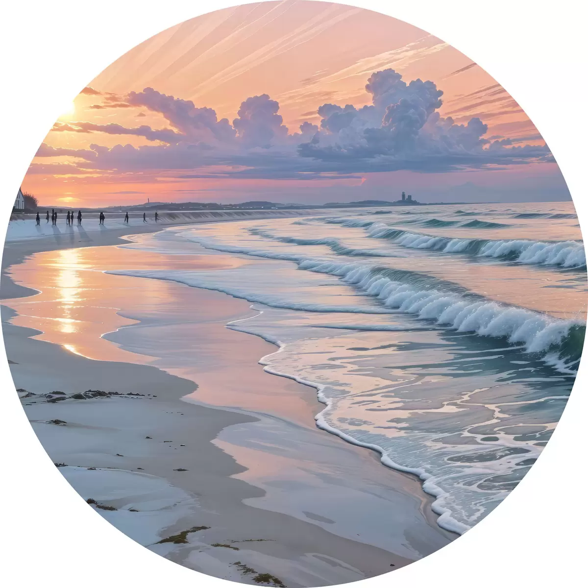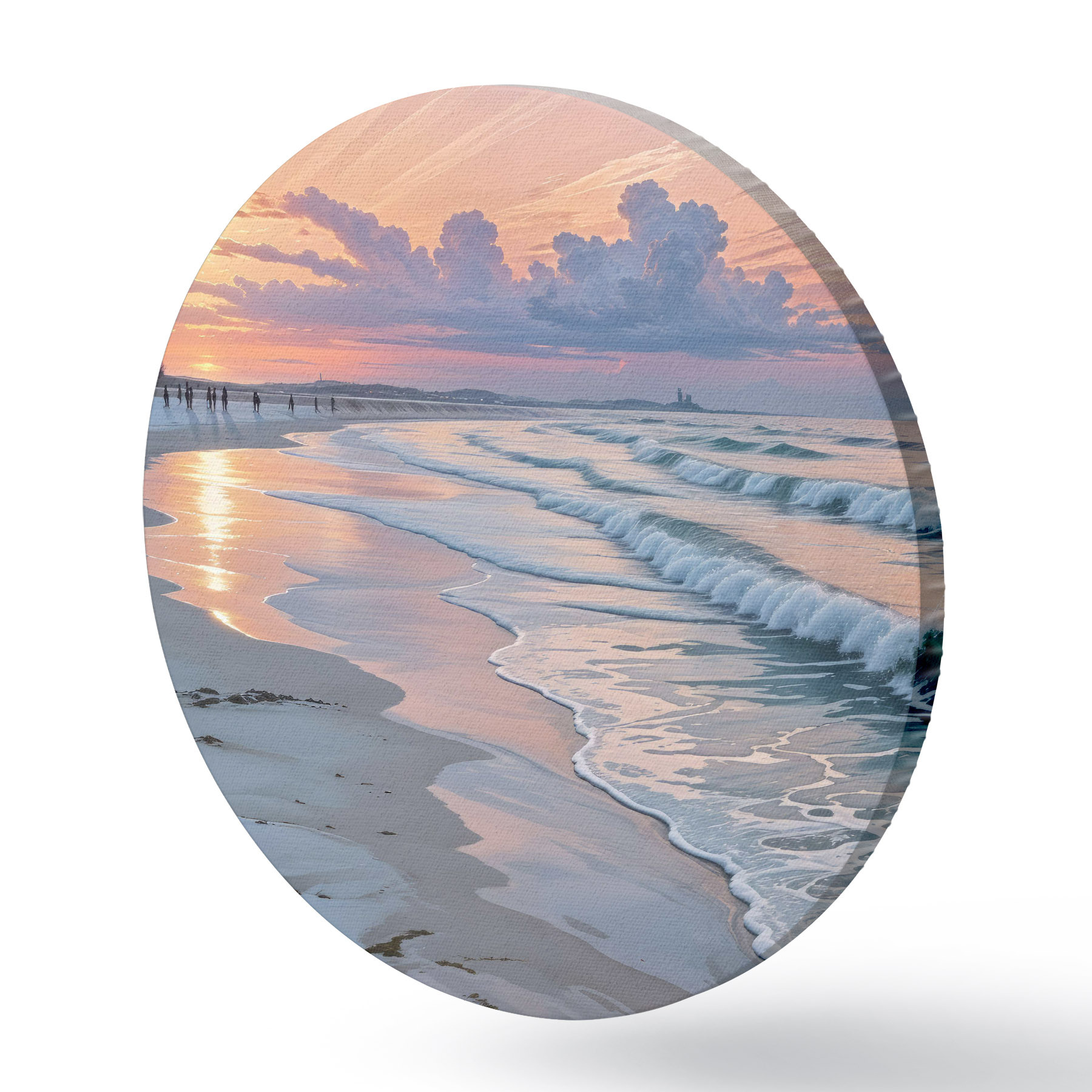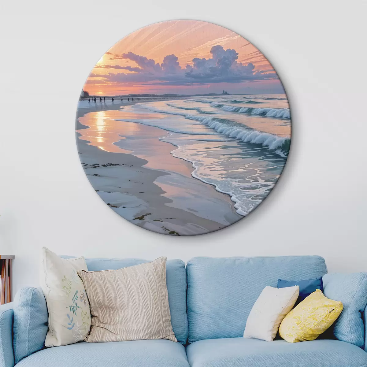 Quadri rotondi Una scena di tranquillità sulla spiaggia al tramonto, con le onde che lambiscono l'arenile r40606