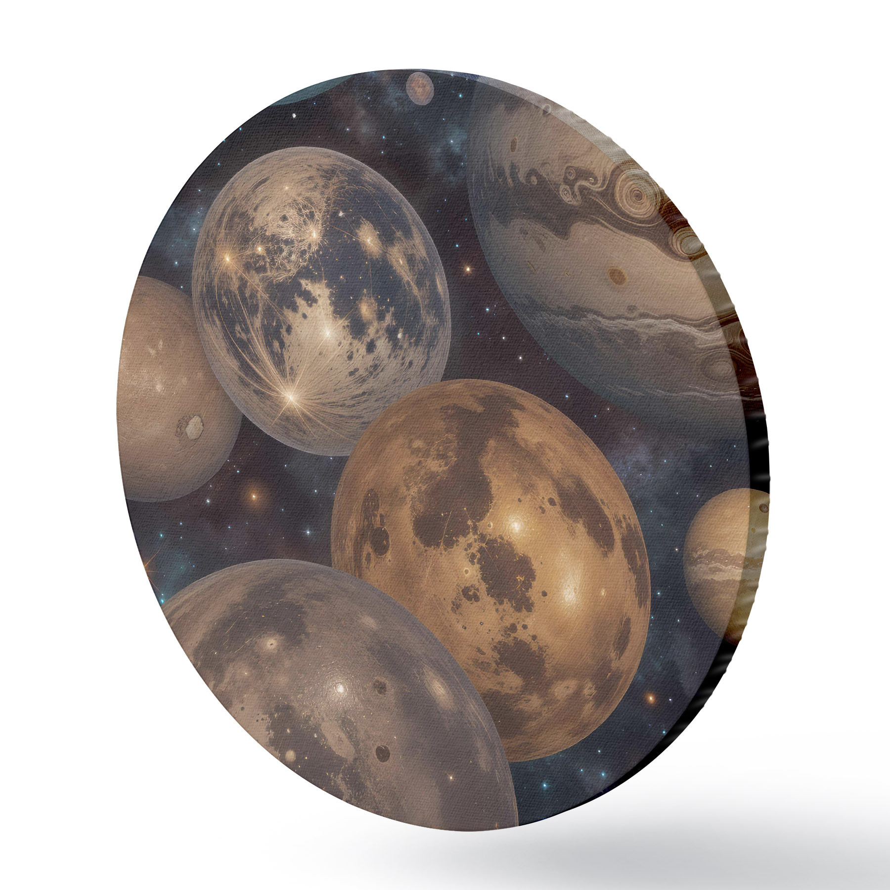 Quadri rotondi Stampa spaziale astratta con pianeti e lune colorate che fluttuano nel cielo notturno stellato r40607