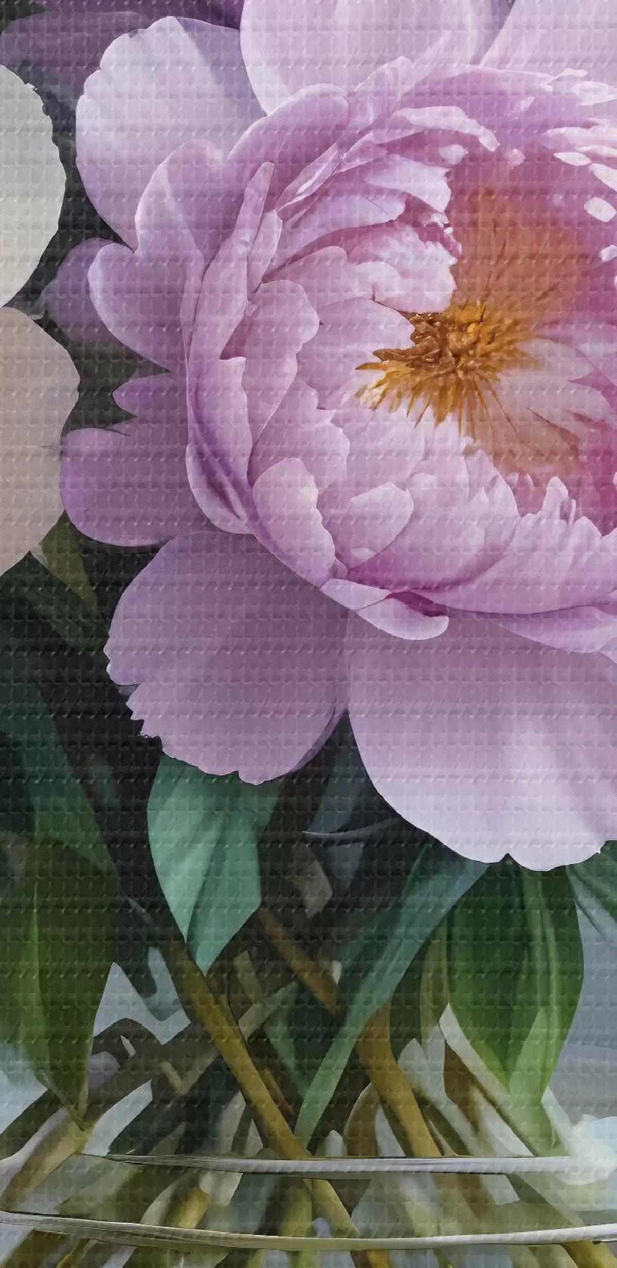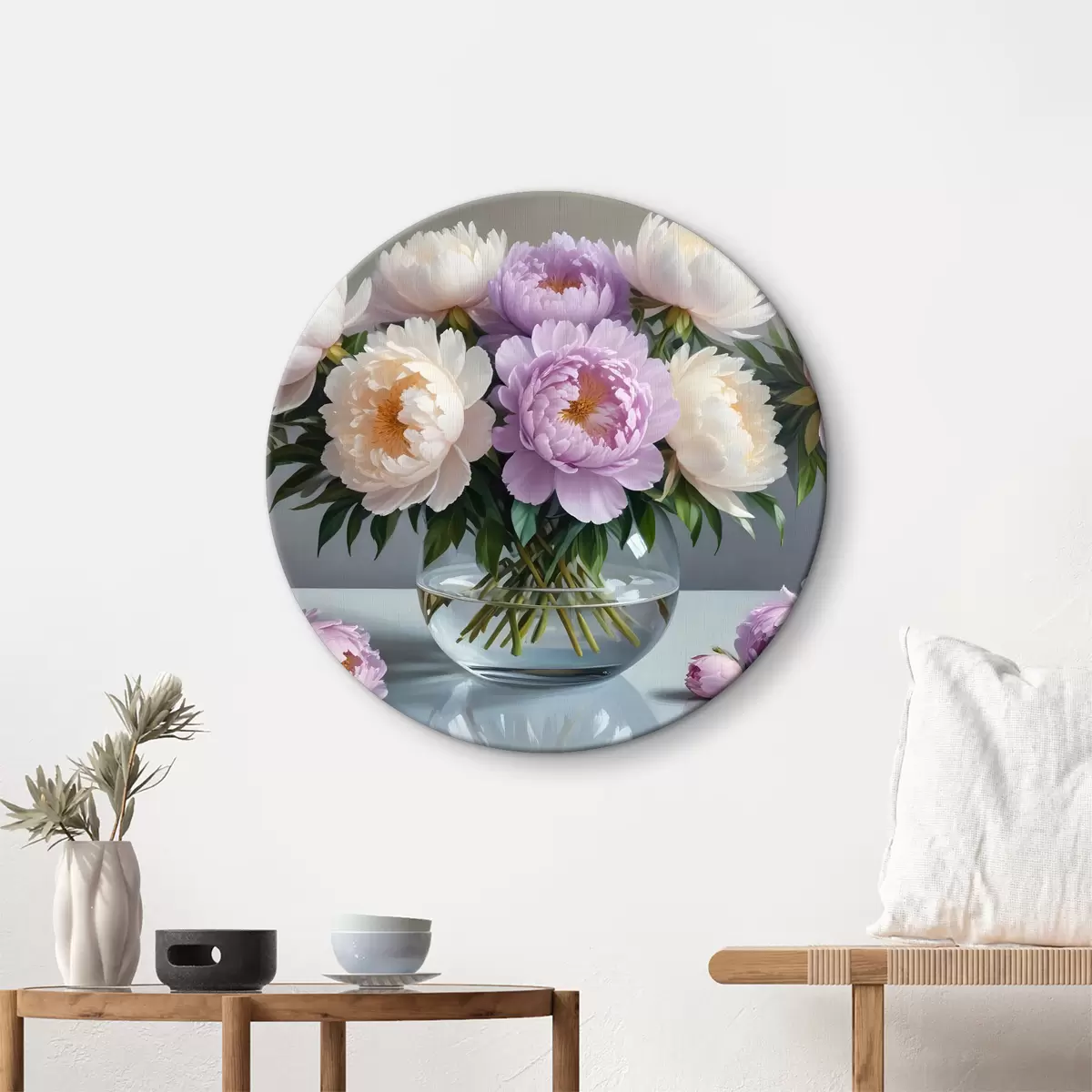 Quadri rotondi Un bouquet di grandi e lussureggianti peonie bianche e rosa in un vaso di vetro su sfondo grigio r40610