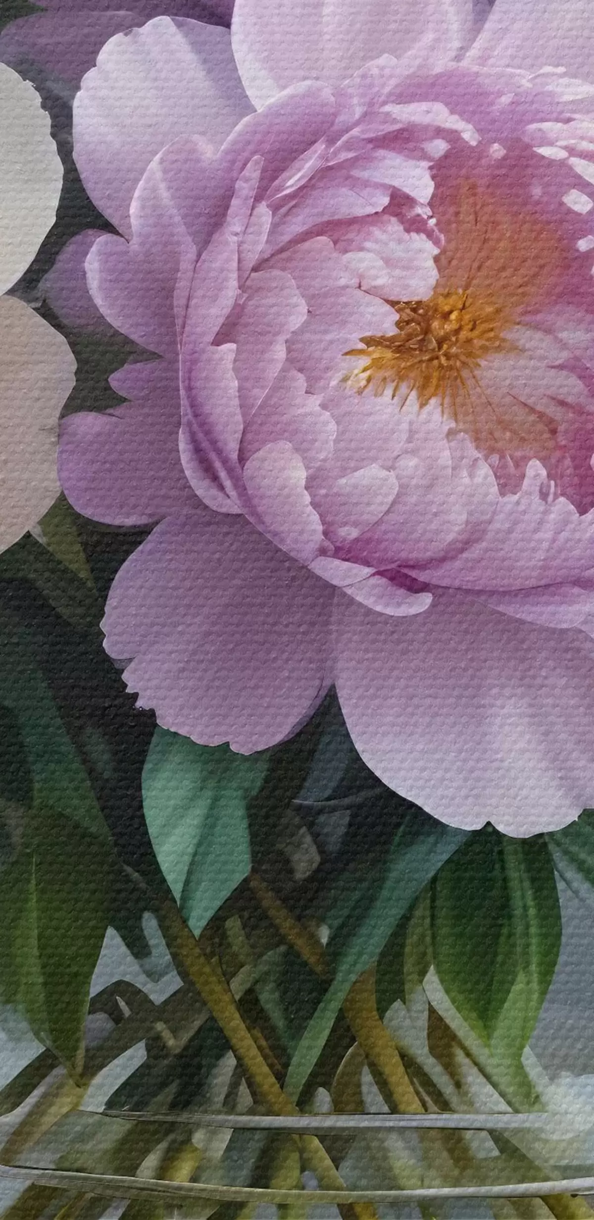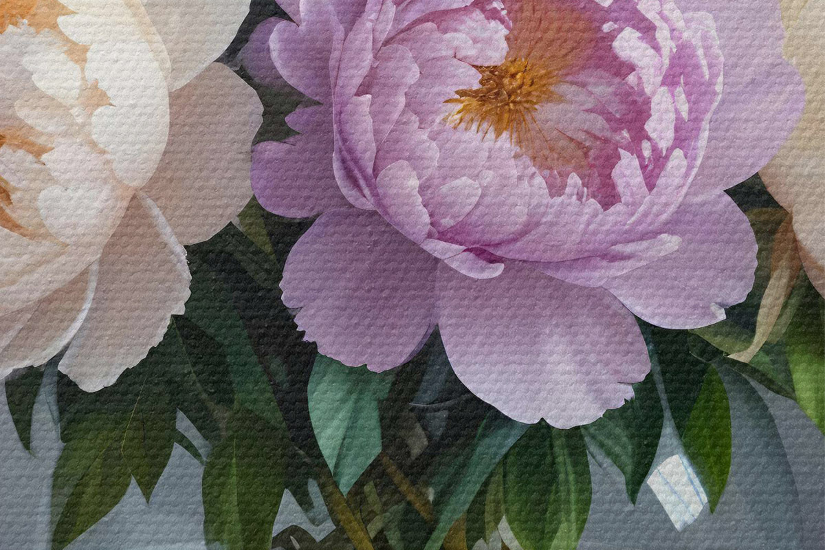Immagine Un bouquet di grandi e lussureggianti peonie bianche e rosa in un vaso di vetro su sfondo grigio Nr r40610