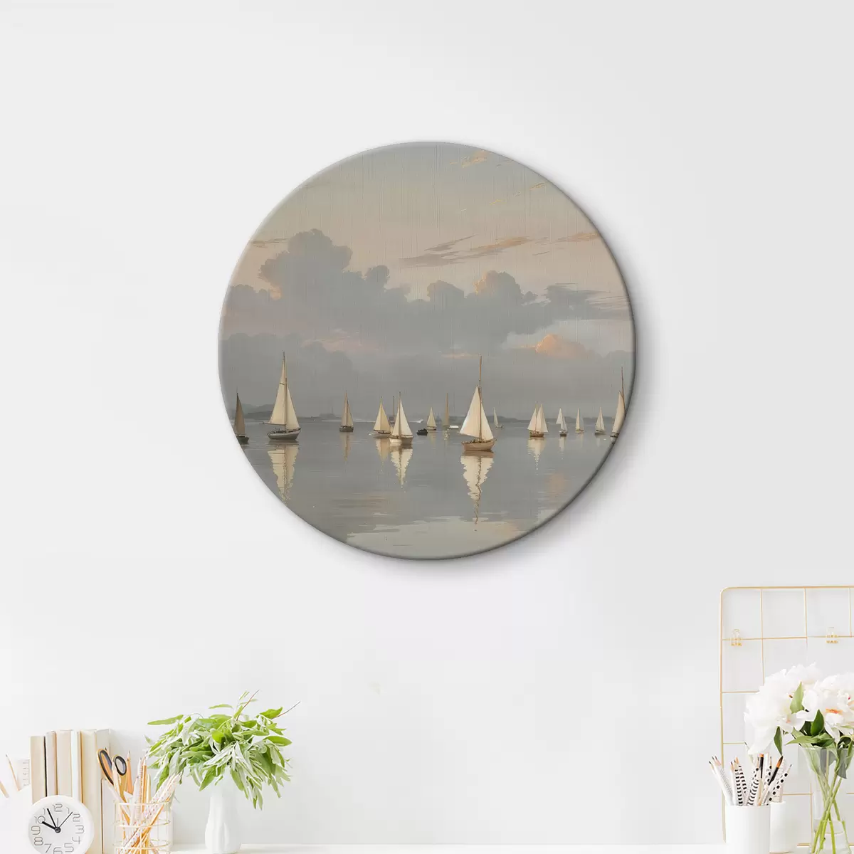 Quadri rotondi Una flotta di barche a vela bianche su uno specchio d'acqua calmo e riflettente al tramonto, con un cielo nuvoloso sullo sfondo r40615