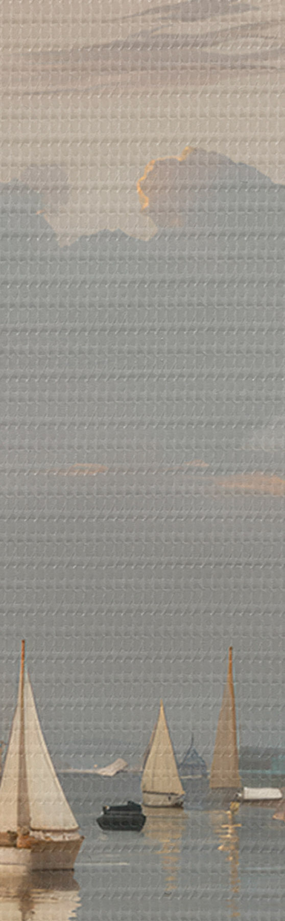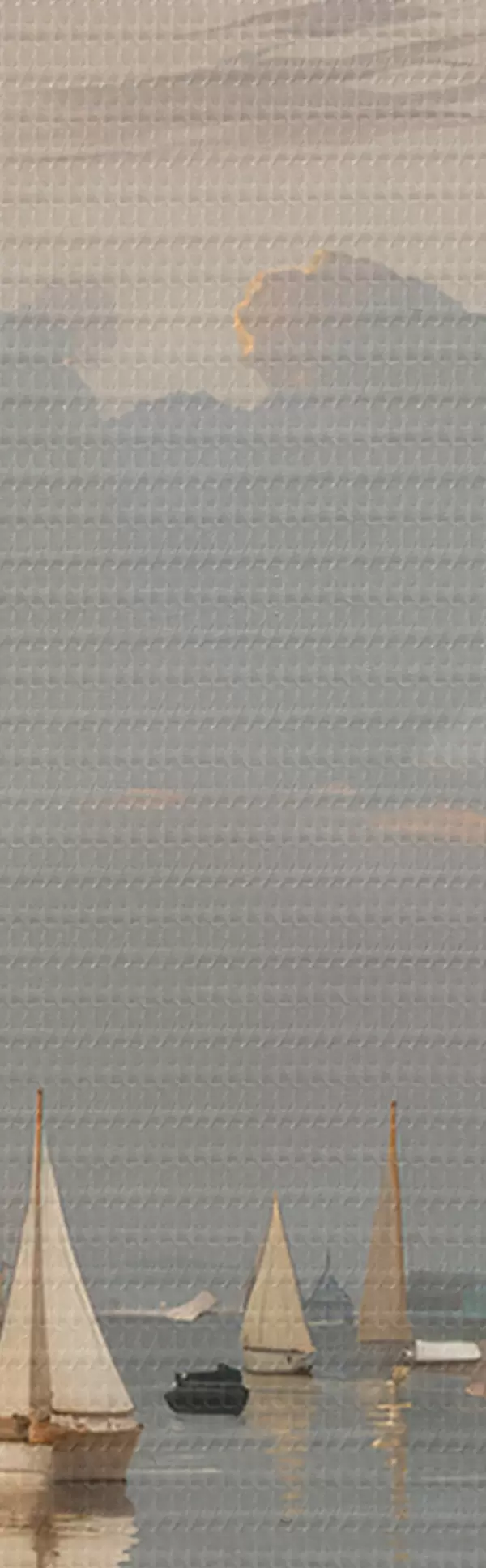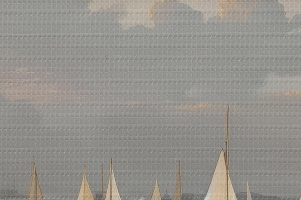 Immagine Una flotta di barche a vela bianche su uno specchio d'acqua calmo e riflettente al tramonto, con un cielo nuvoloso sullo sfondo Nr r40615