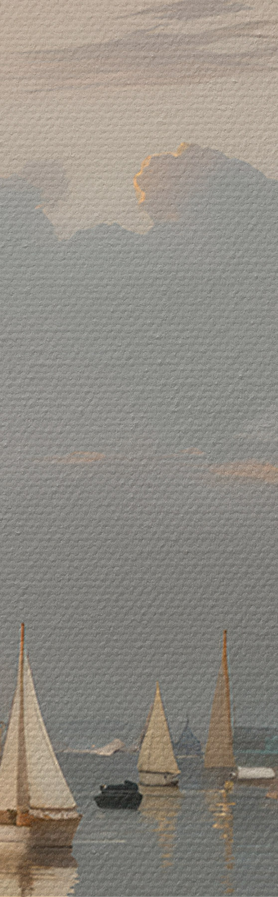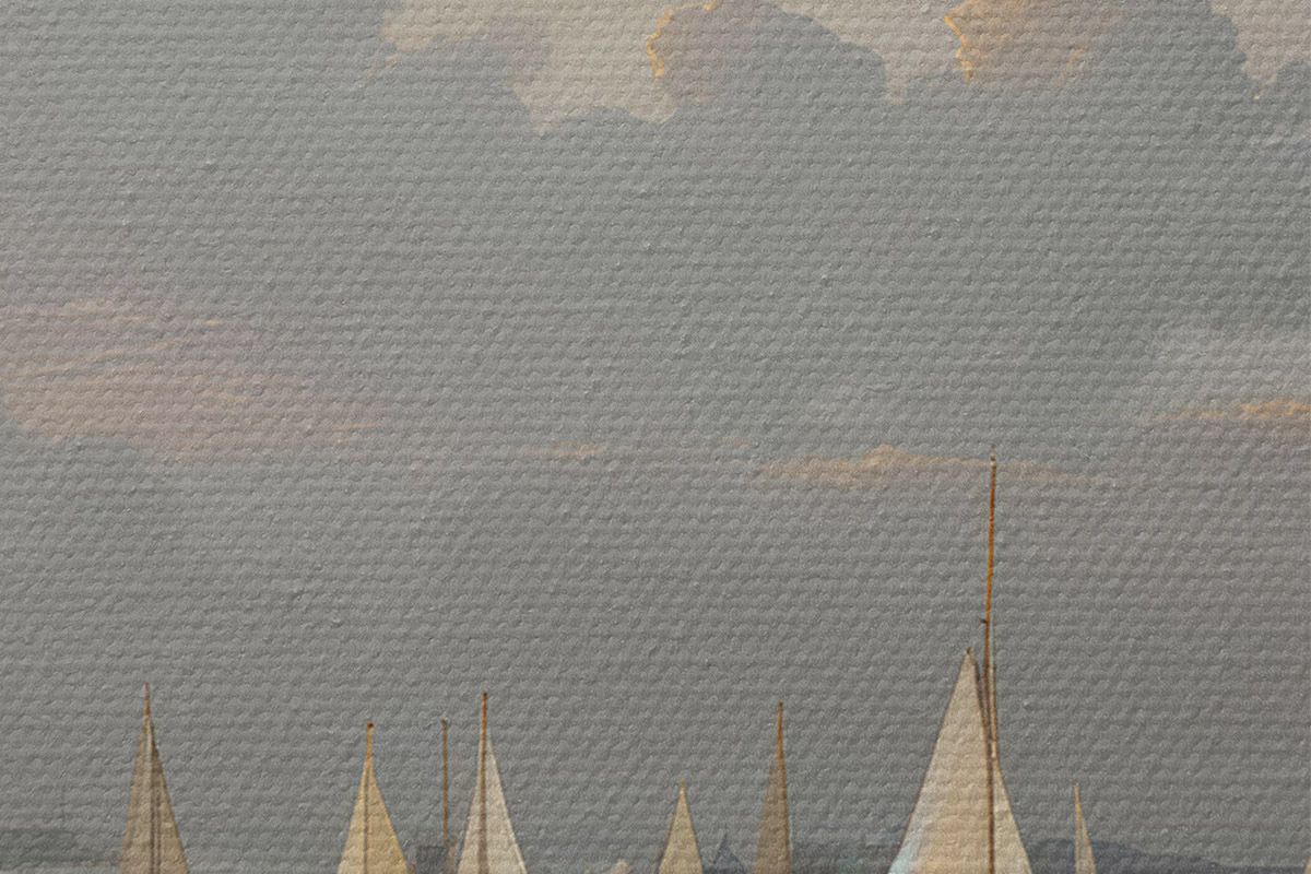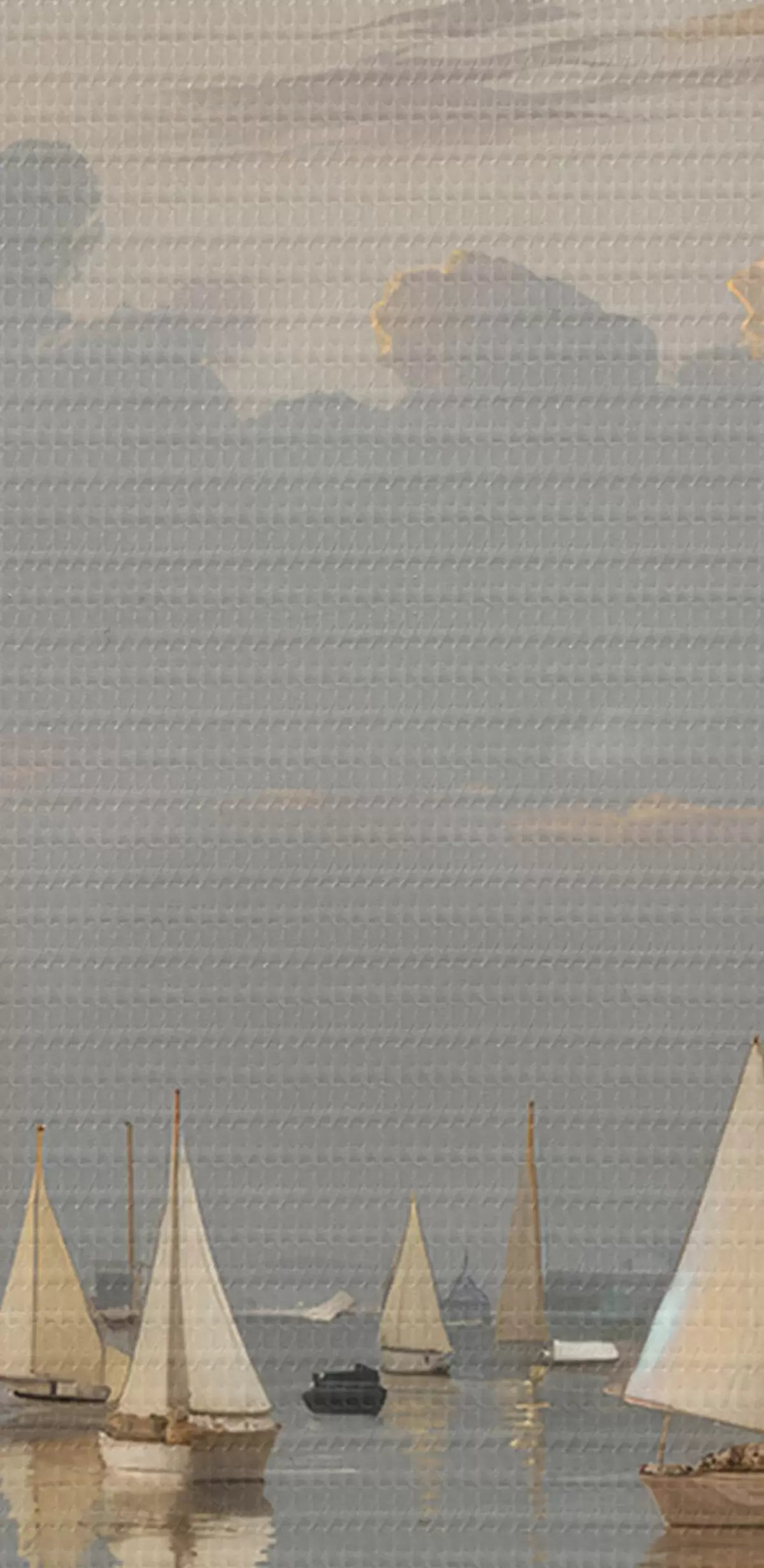 Immagine Una flotta di barche a vela bianche su uno specchio d'acqua calmo e riflettente al tramonto, con un cielo nuvoloso sullo sfondo Nr r40615