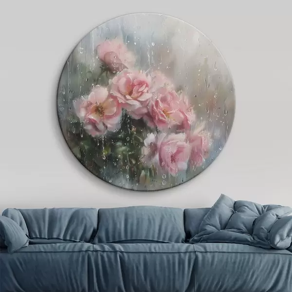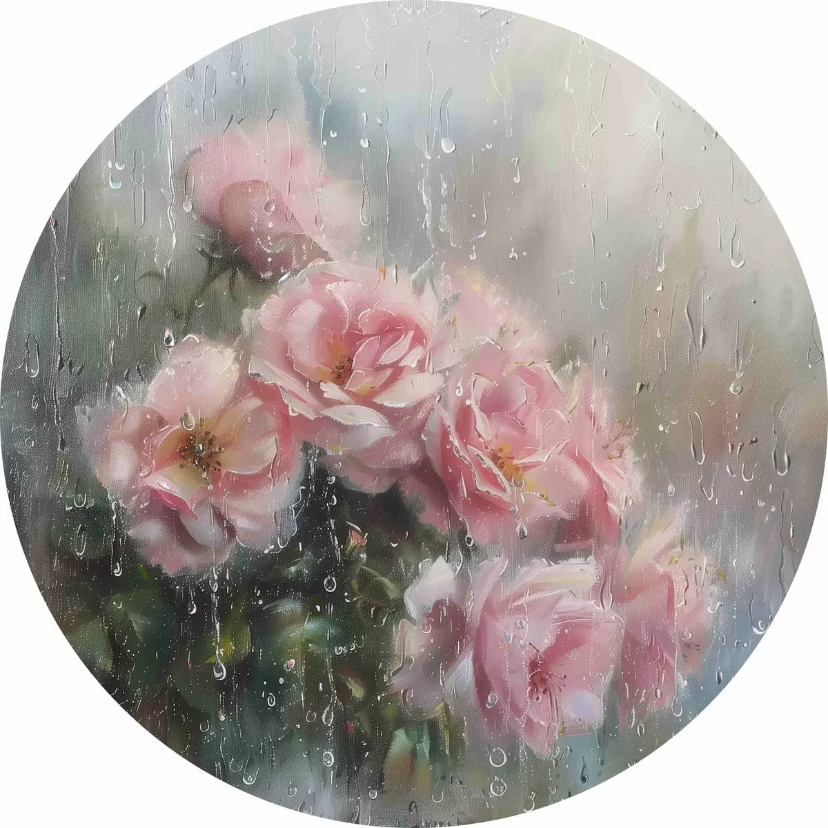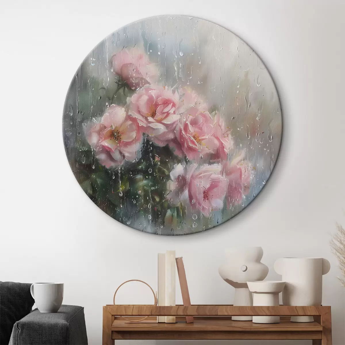 Quadri rotondi Un bouquet di rose rosa fuori dalla finestra in un tempo piovoso r40656
