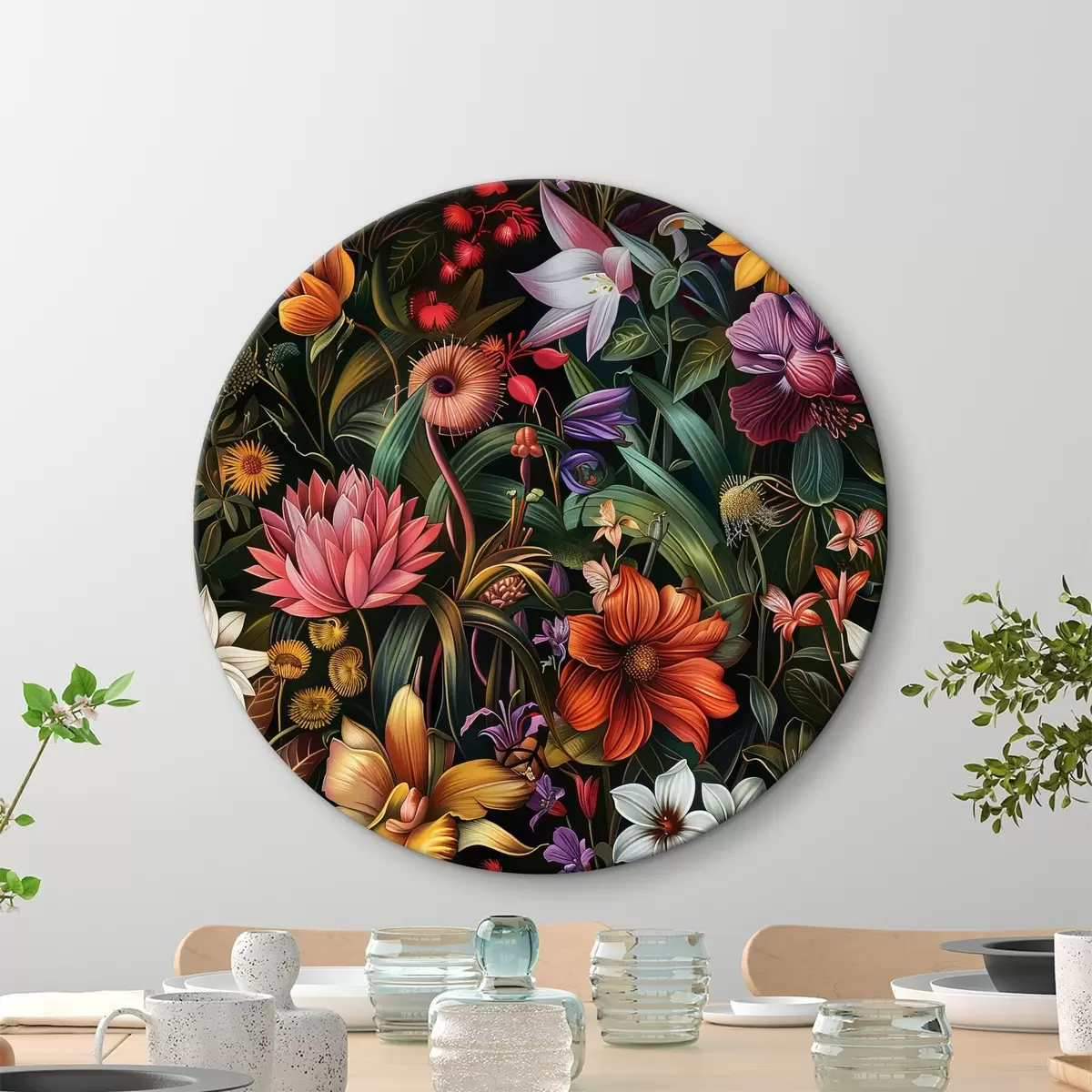 Quadri rotondi Composizione tropicale con vari tipi di verde e fiori tropicali r40667