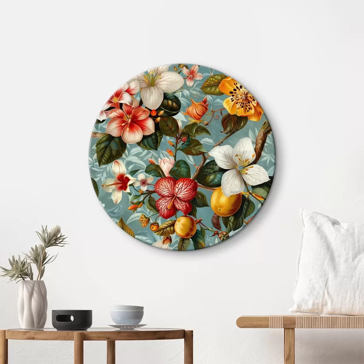 Quadri rotondi Composizione con vari fiori verdi e tropicali su uno sfondo blu r40668
