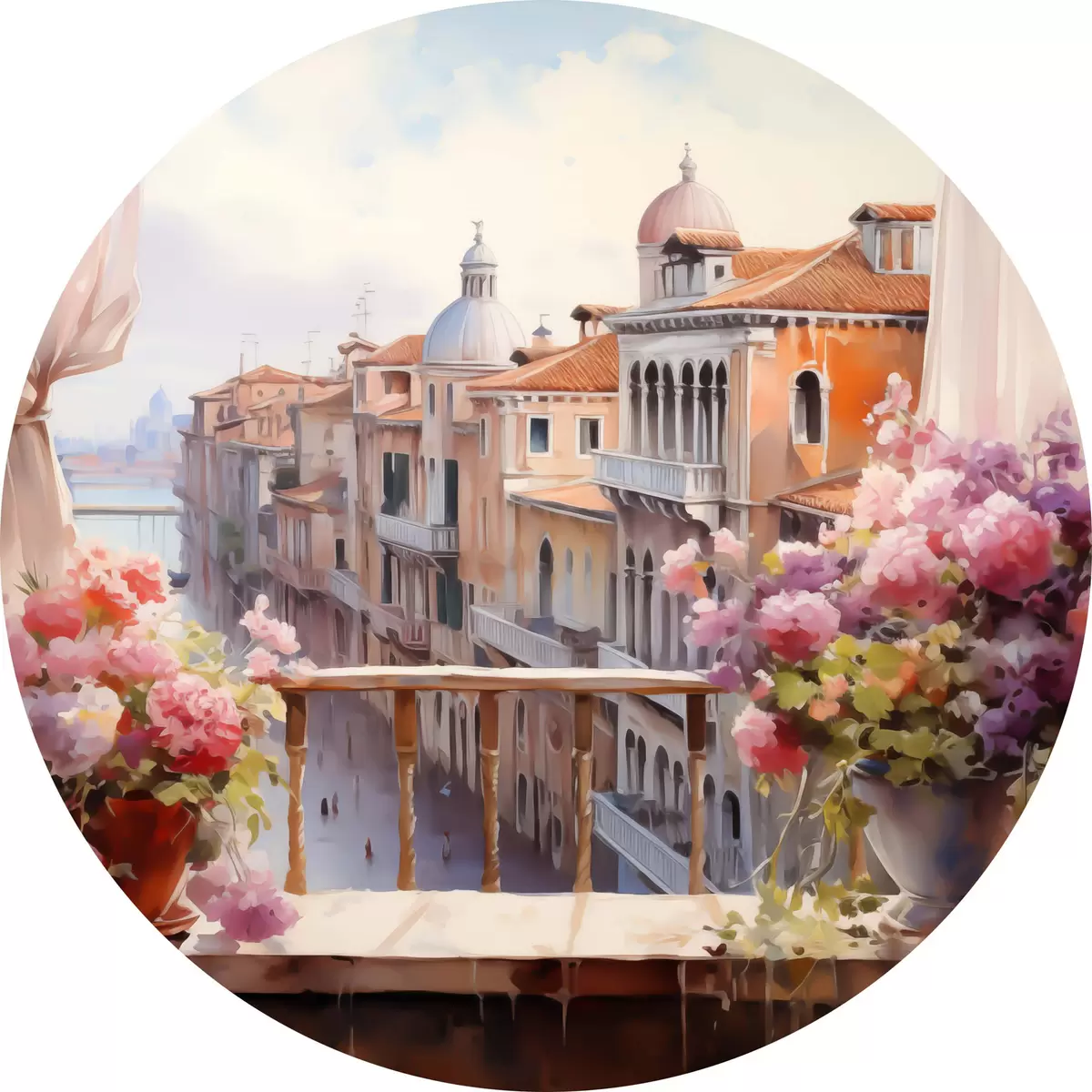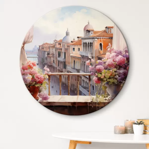 Quadri rotondi Fiori in vasi con vista sulla baia a Venezia acquerello r40677