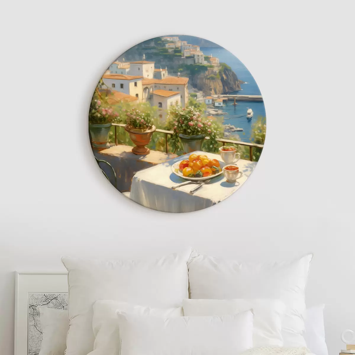 Quadri rotondi Arance in un piatto su un tavolo con vista sul mare e sulla città r40719