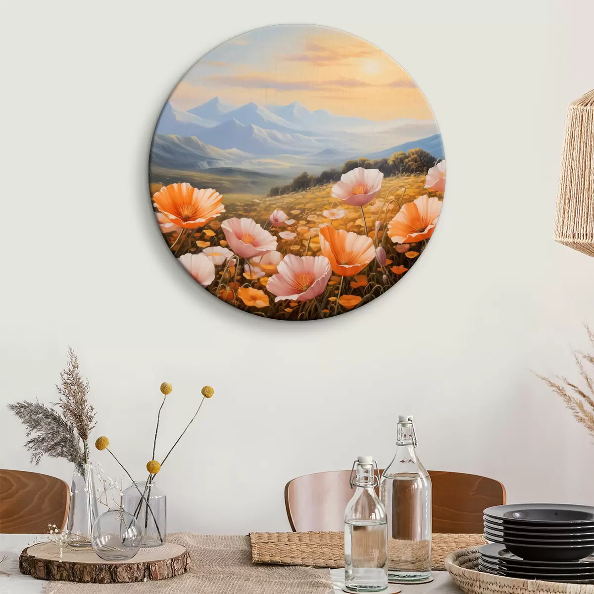 Quadri rotondi Un campo di papaveri all'alba con le montagne sullo sfondo r40730