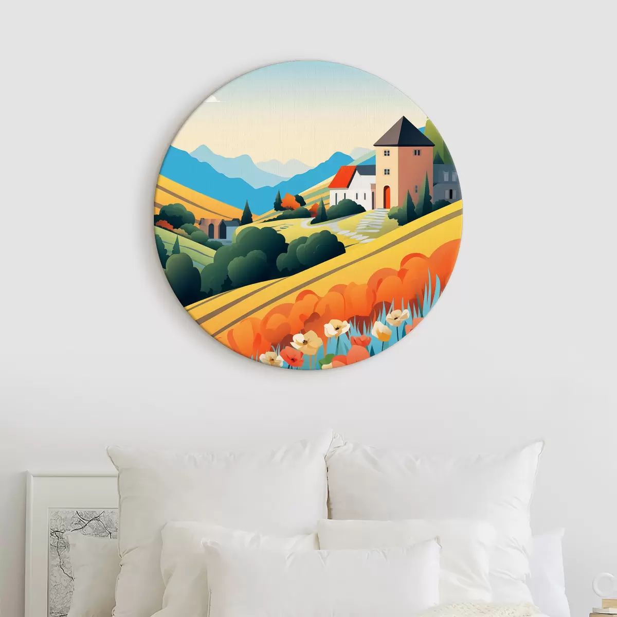 Quadri rotondi Luminoso paesaggio rurale con campi, papaveri e case r40756
