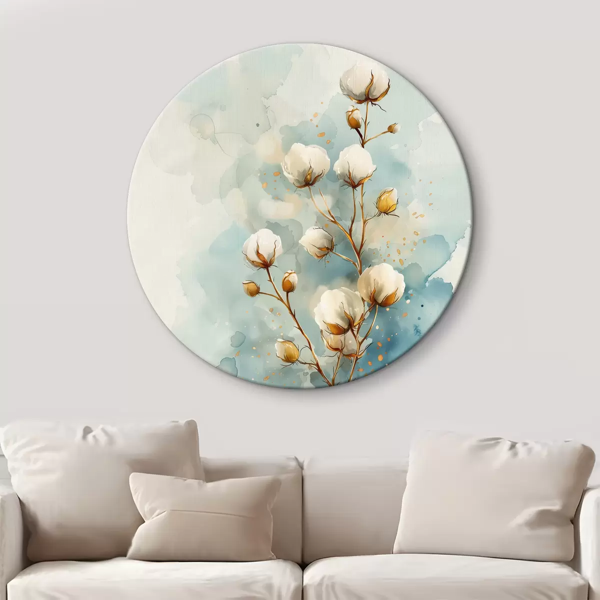 Quadri rotondi Un rametto di cotone su uno sfondo acquerellato r40780