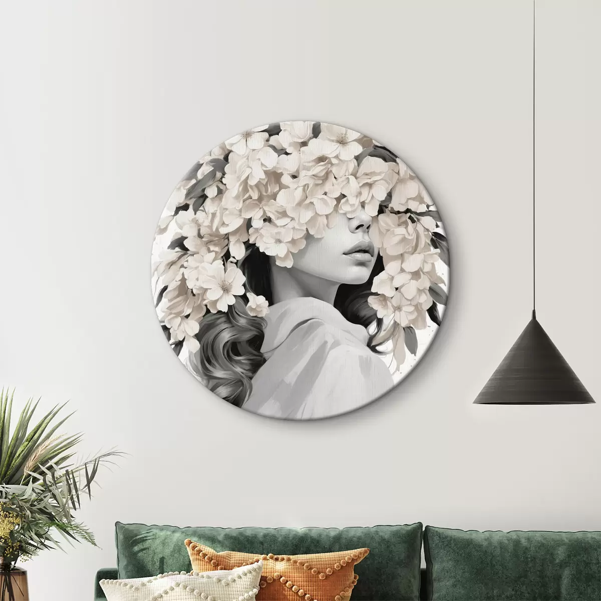 Quadri rotondi Ragazza con fiori sul viso nei colori bianco e nero r40849
