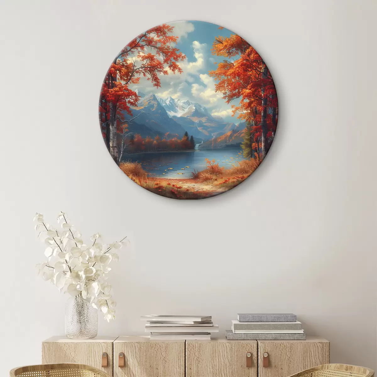 Quadri rotondi Paesaggio autunnale sullo sfondo delle montagne vicino allo stagno r40903