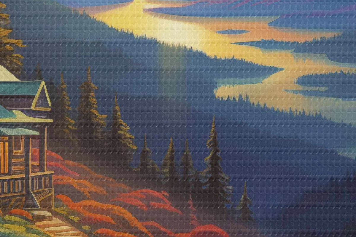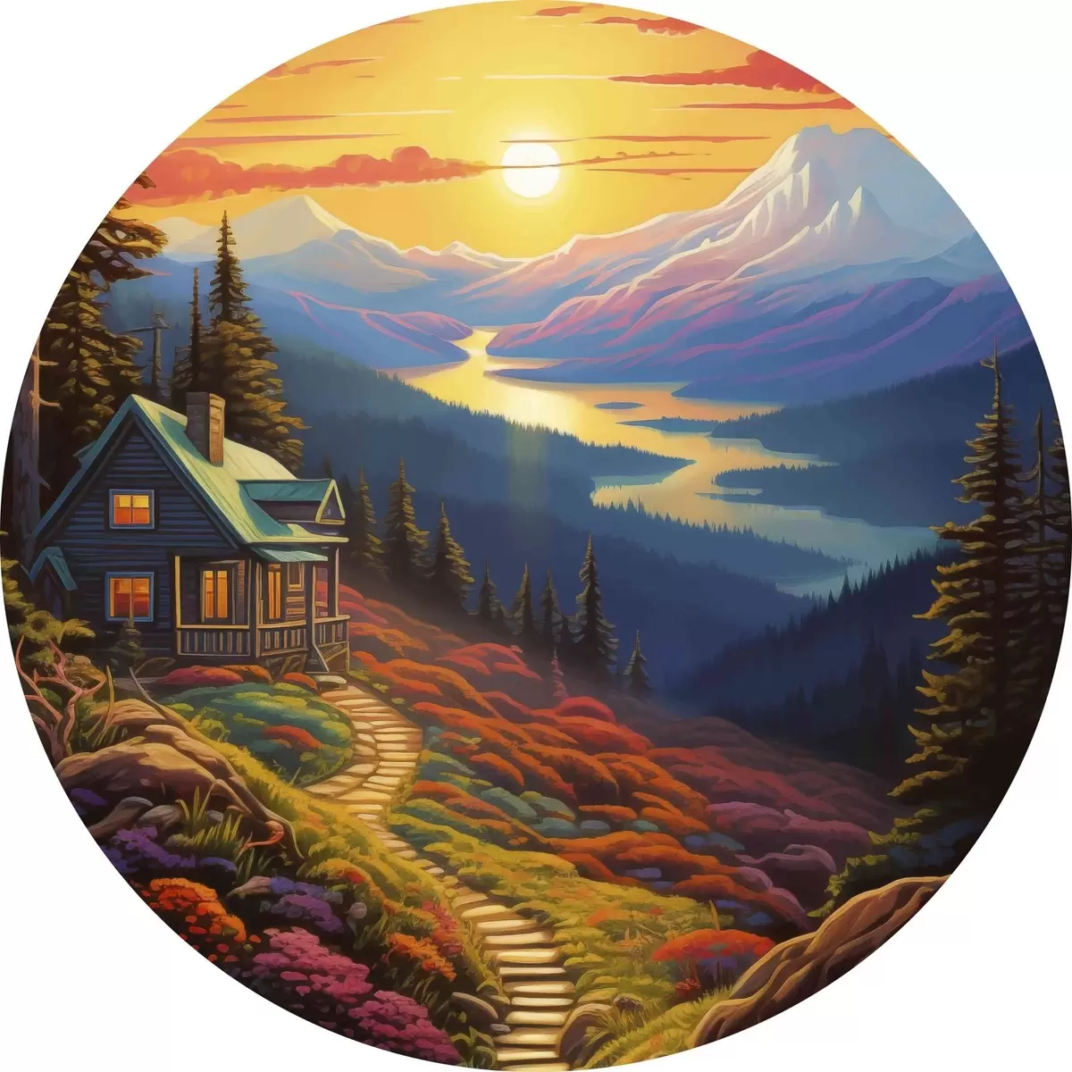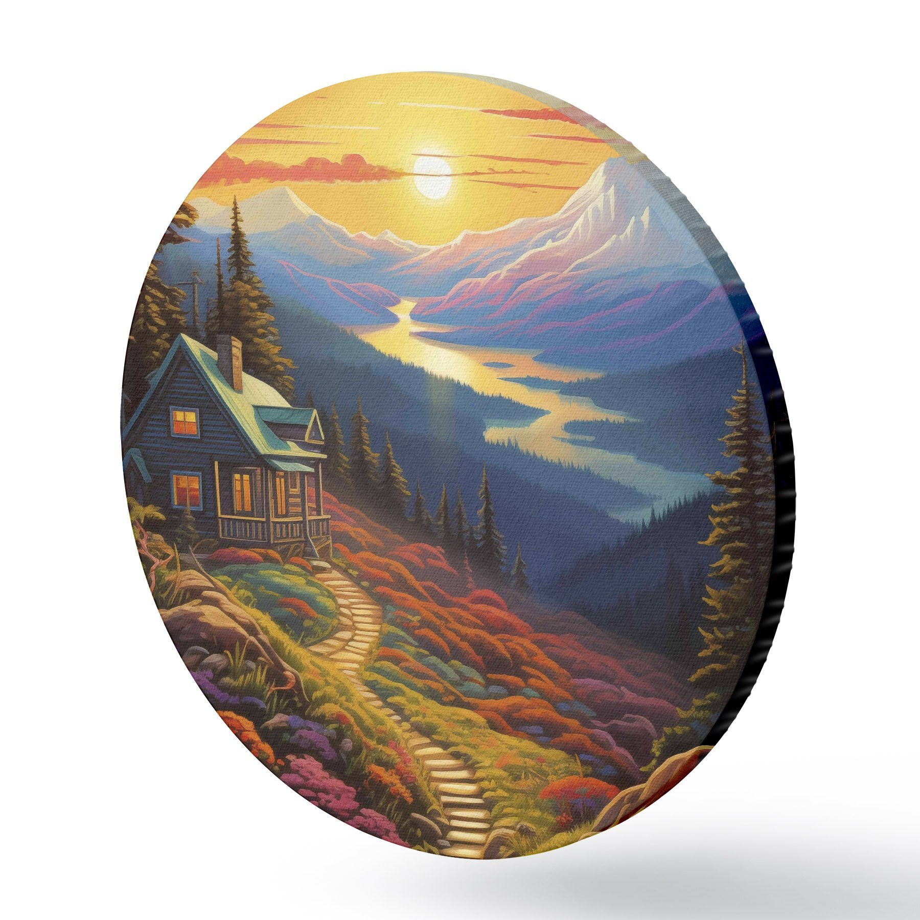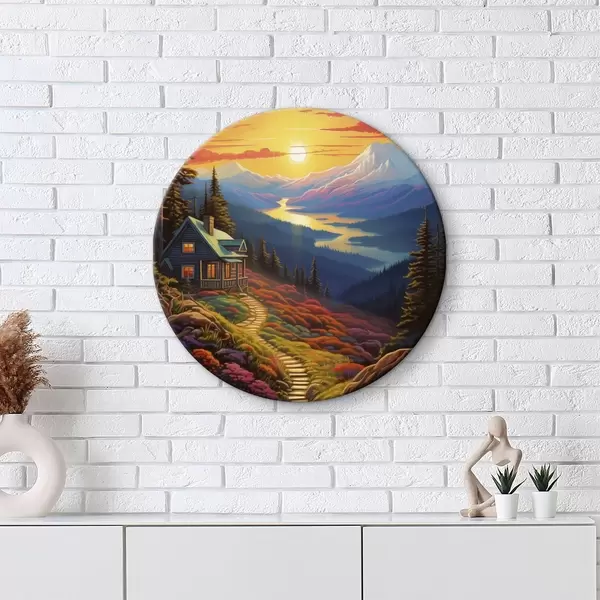 Quadri rotondi Paesaggio colorato con montagne e casa di legno, colori del tramonto r40941