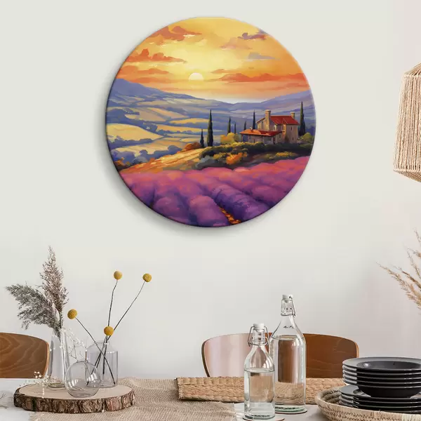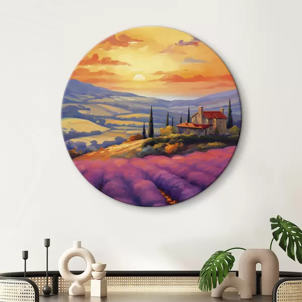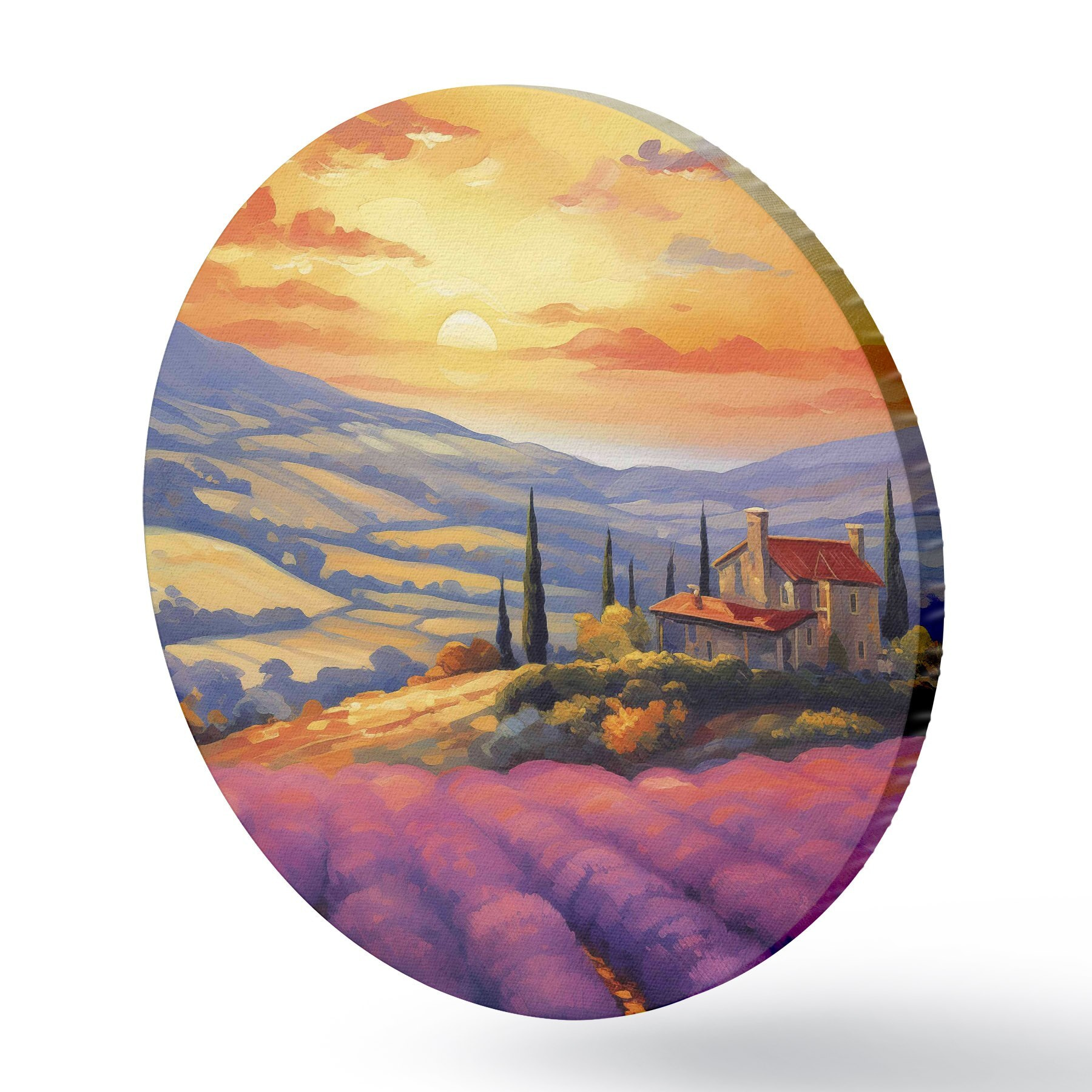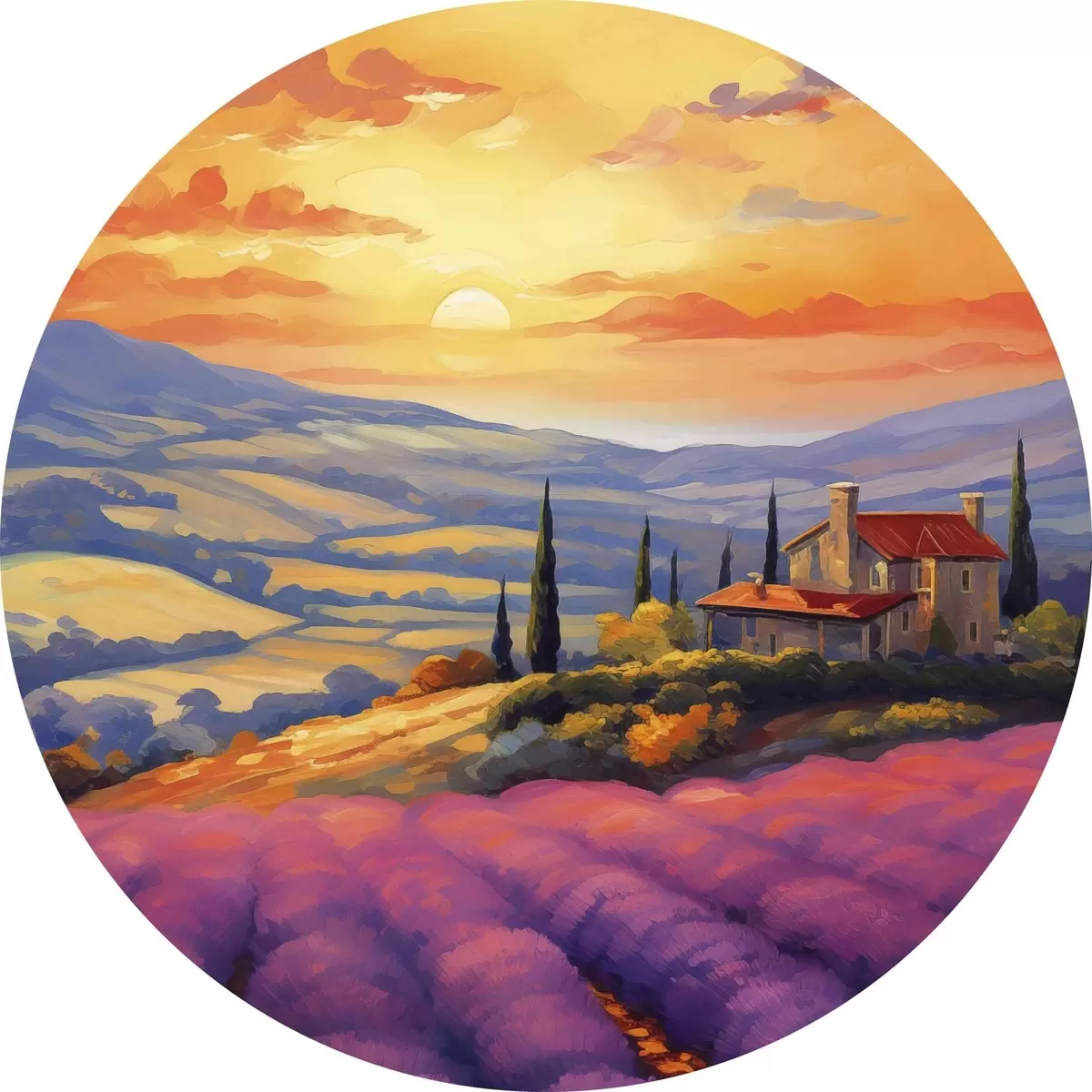 Quadri rotondi Tramonto in Toscana, campi di lavanda, bei paesaggi, acquerello r40942