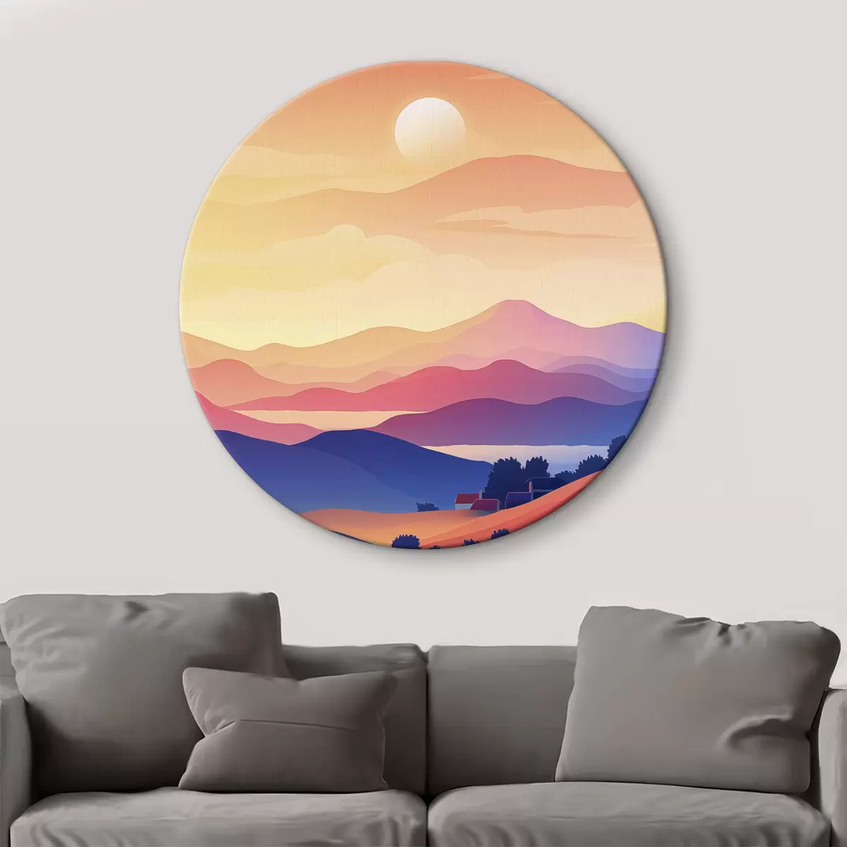 Quadri rotondi Astrazione paesaggi, montagne, tramonto, case r40948
